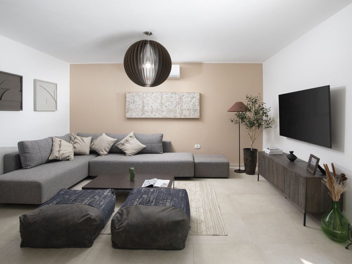 The 120m2 villa features a living room with a cozy couch and satellite TV, as well as a fully equipped kitchen with a dining area that seats 6.