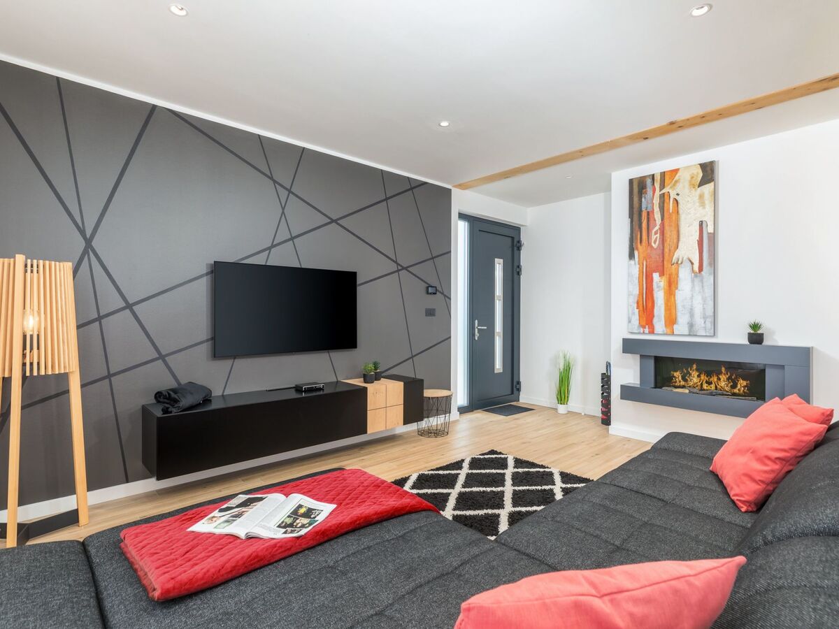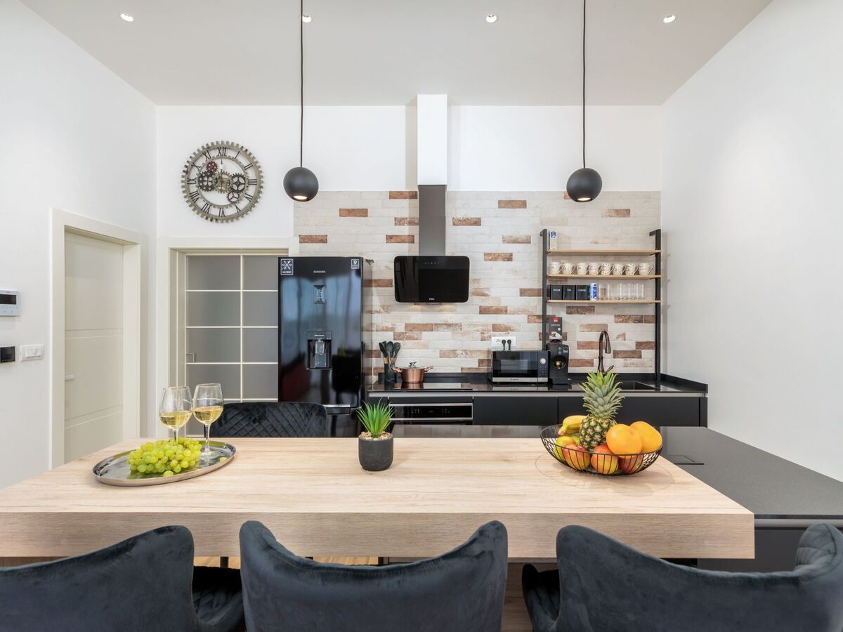 The spacious living room with a modern, fully equipped kitchen, an elegant dining table and a bar invites you to pleasant gatherings and gastronomic delights.