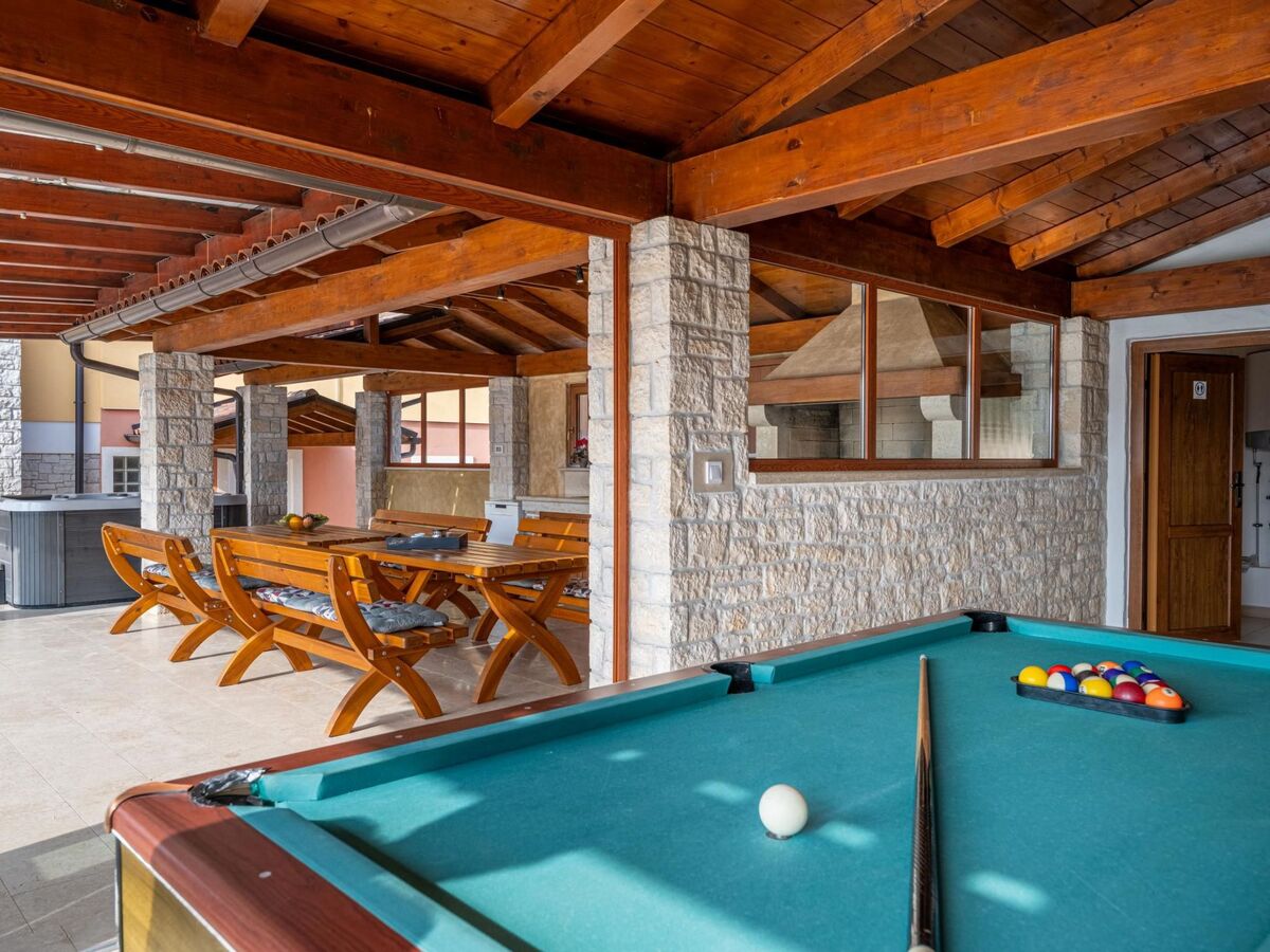 The exterior of Villa Suzanne offers guests a large swimming pool of 80 m2, 16 deckchairs for sunbathing, billiards, table tennis, table football, darts, a summer kitchen with a grill, and a dining table for 16 people.