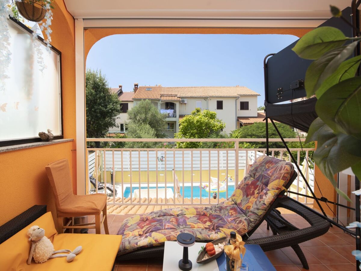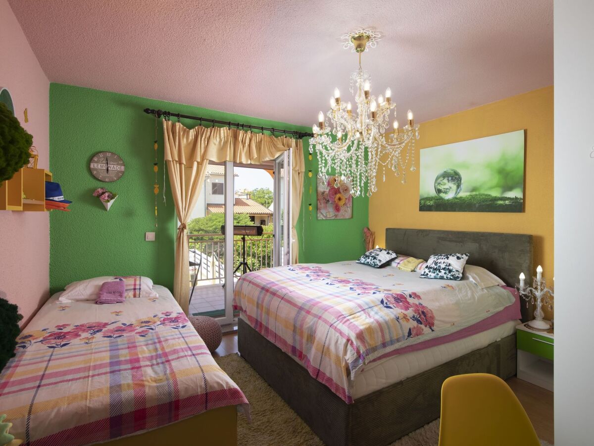 A bedroom on this floor includes a double bed and a single bed, with direct access to a balcony overlooking the pool.