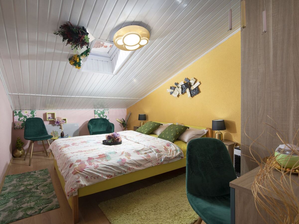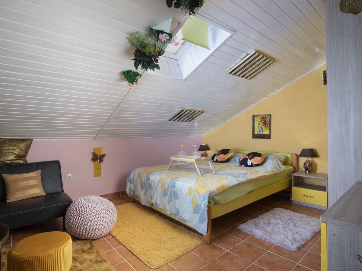 Between the ground and first floors, on a mezzanine level, there is a bedroom with a double bed.