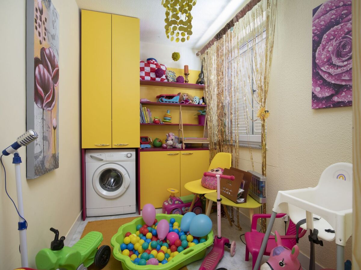 A bathroom with walk-in shower, toilet, and sink is also located on this level, along with a utility room containing a washing machine and children's toys.