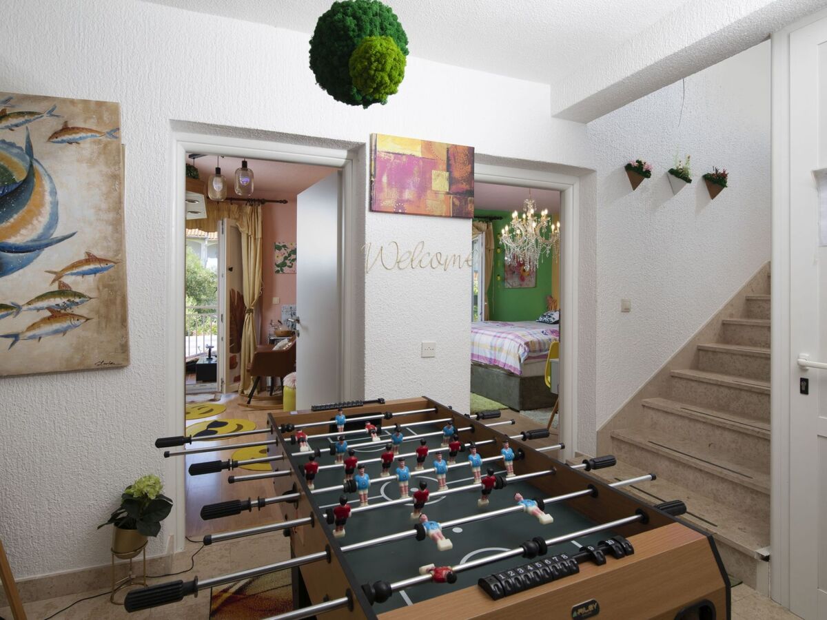 The first floor, accessible by both indoor and outdoor stairs, includes a football table and two bathrooms: one with a shower, sink, and toilet, and another with a bathtub and sink.