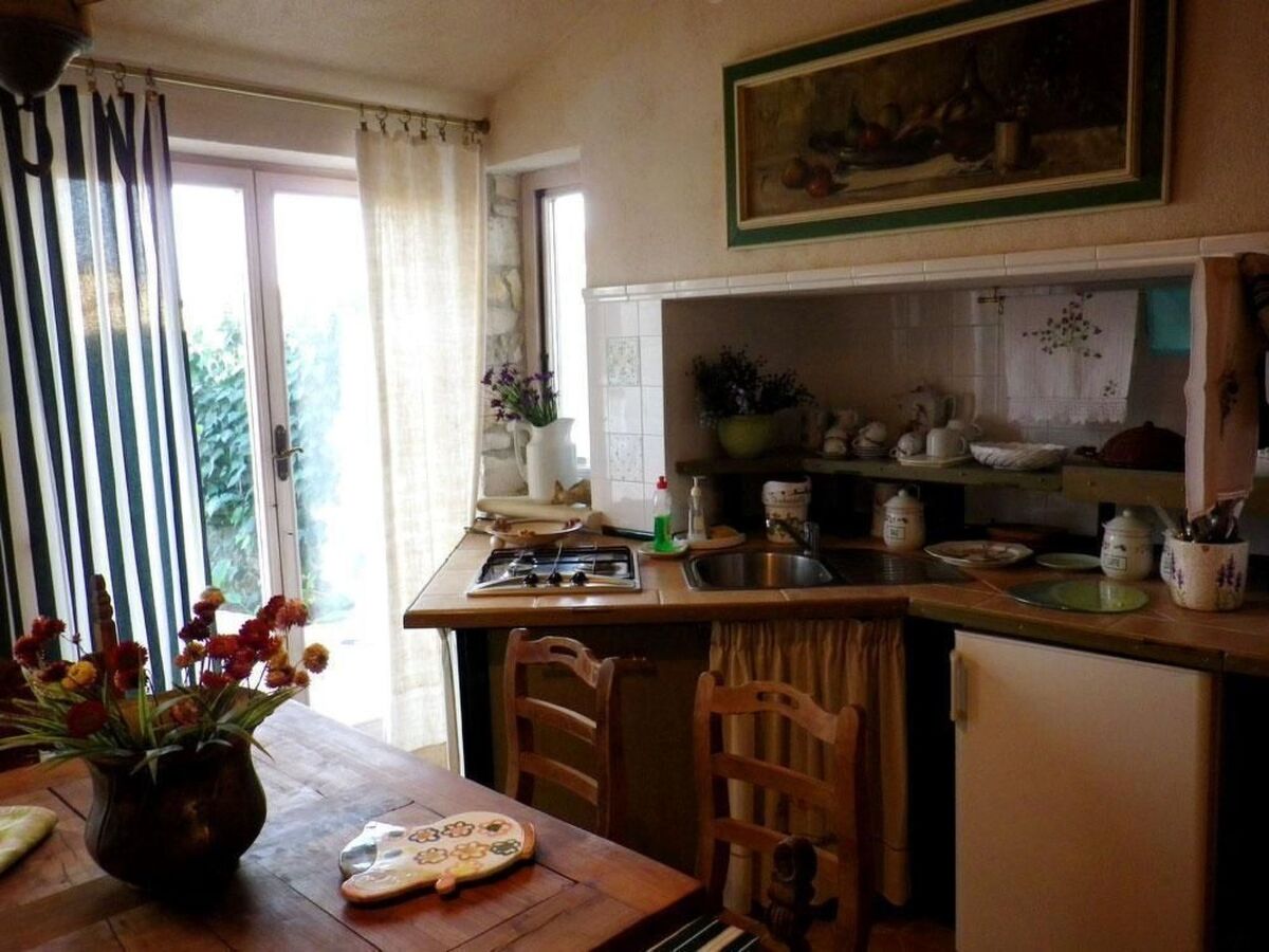 The kitchen area has a brick kitchenette equipped with a gas cooker, filter coffee machine and refrigerator with ice compartment.