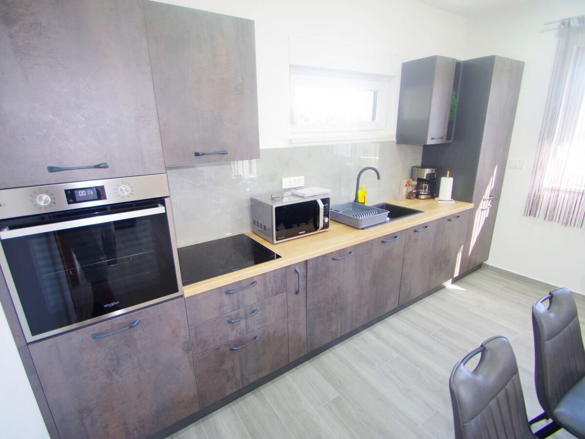- kitchen ( induction stove with 4 cooking rings, refrigerator with freezing section, dish washer kettle, coffee machine (filter), oven, toaster, hood, utensils for cooking and eating, microwave )