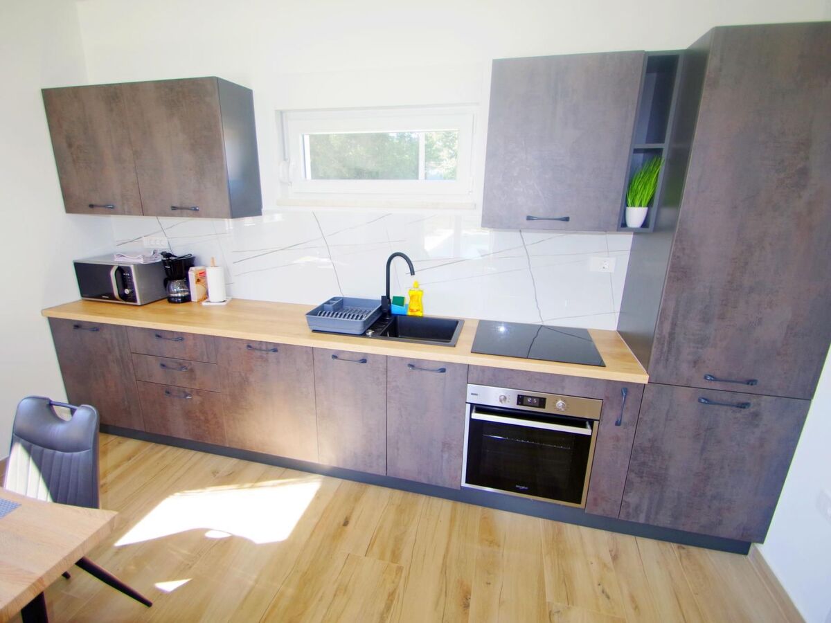 - kitchen ( induction stove with 4 cooking rings, refrigerator with freezing section, dish washer kettle, coffee machine (filter), oven, toaster, hood, utensils for cooking and eating, microwave )