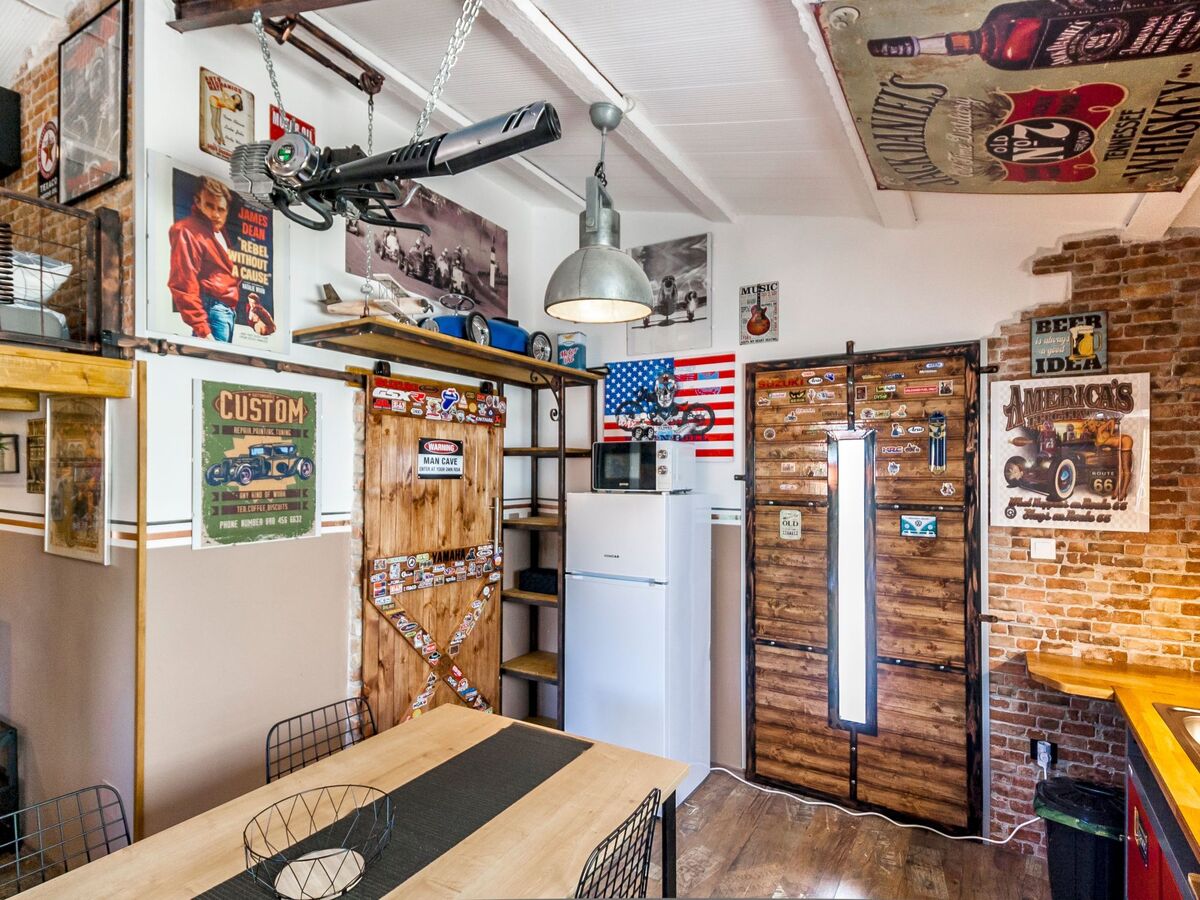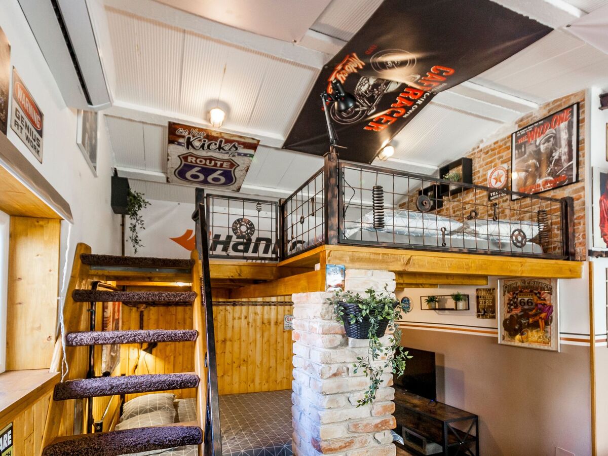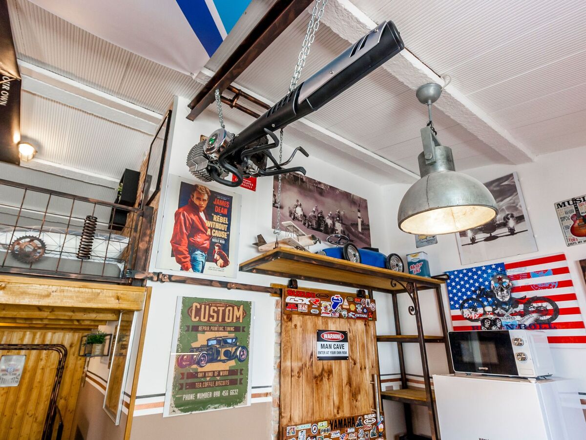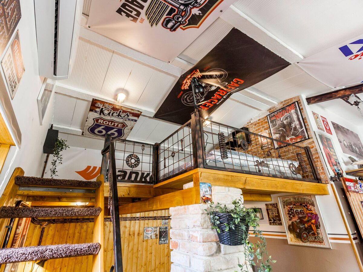 Made in industrial style from old motorcycle parts, stickers, posters, frames, banners...