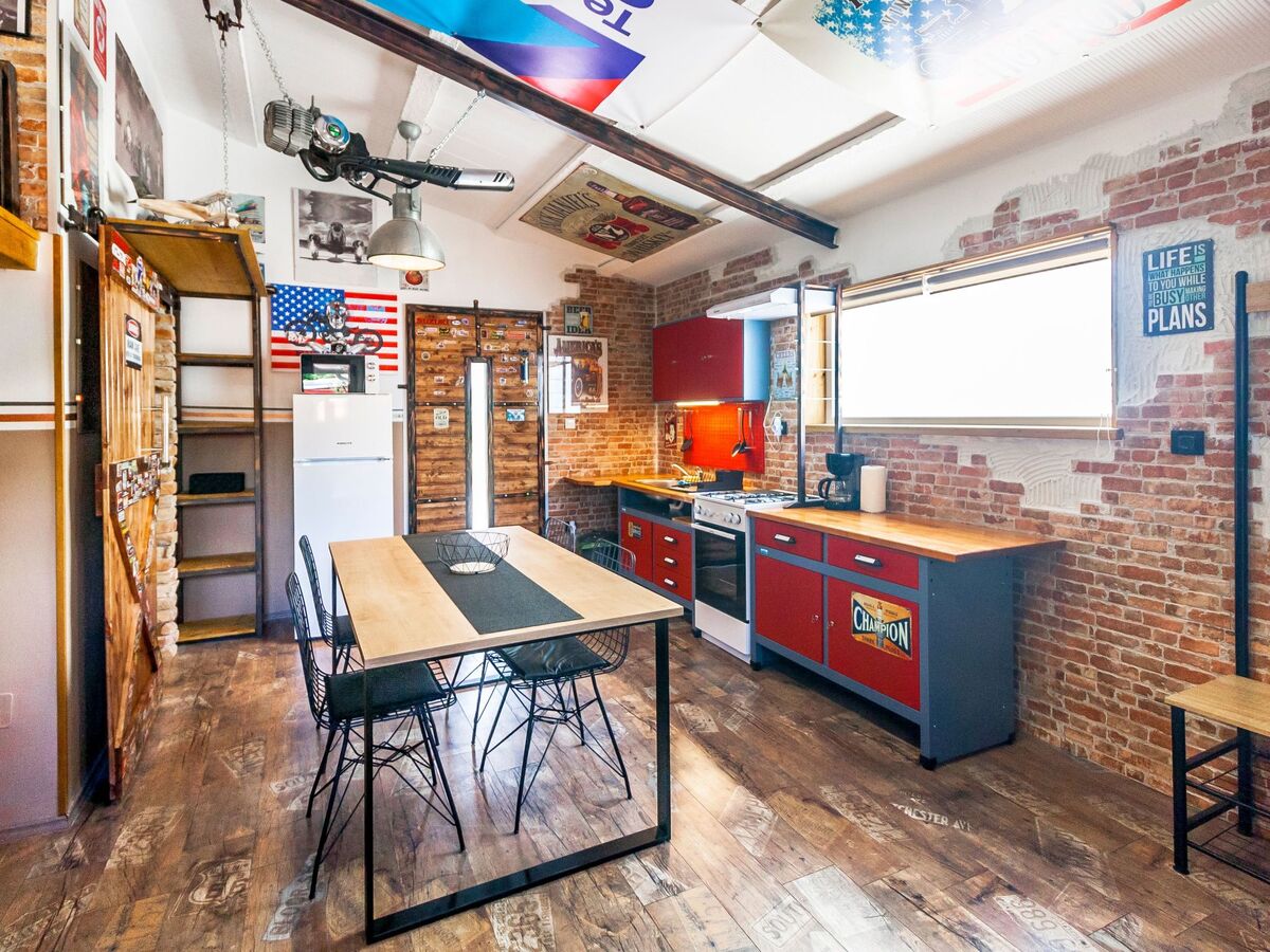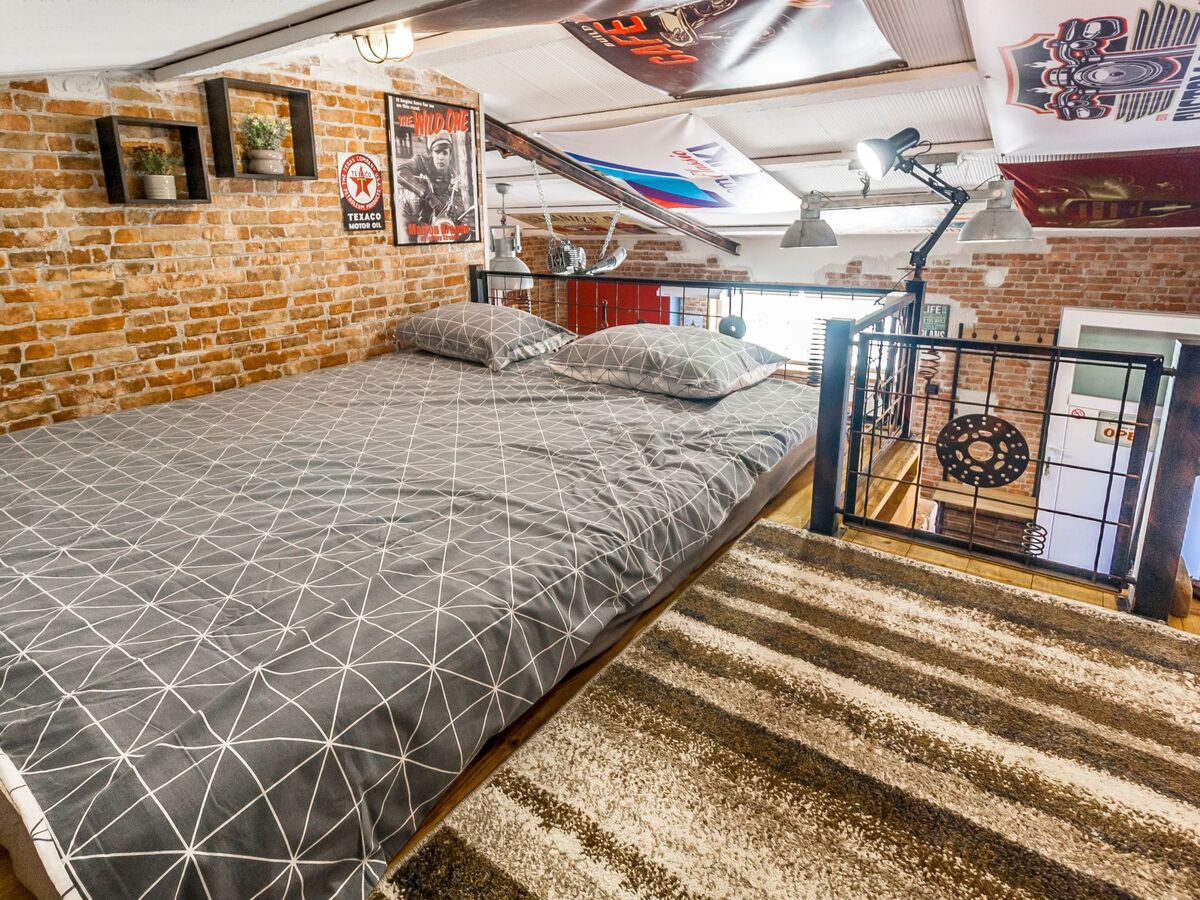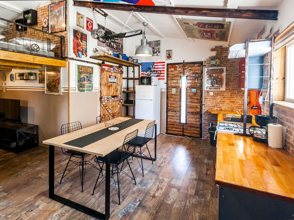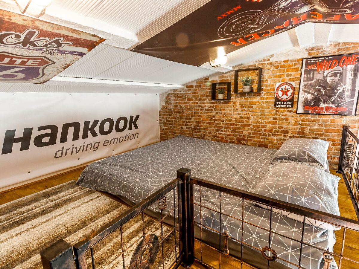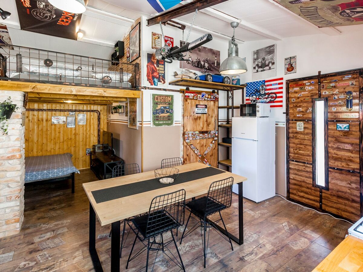Made in industrial style from old motorcycle parts, stickers, posters, frames, banners...