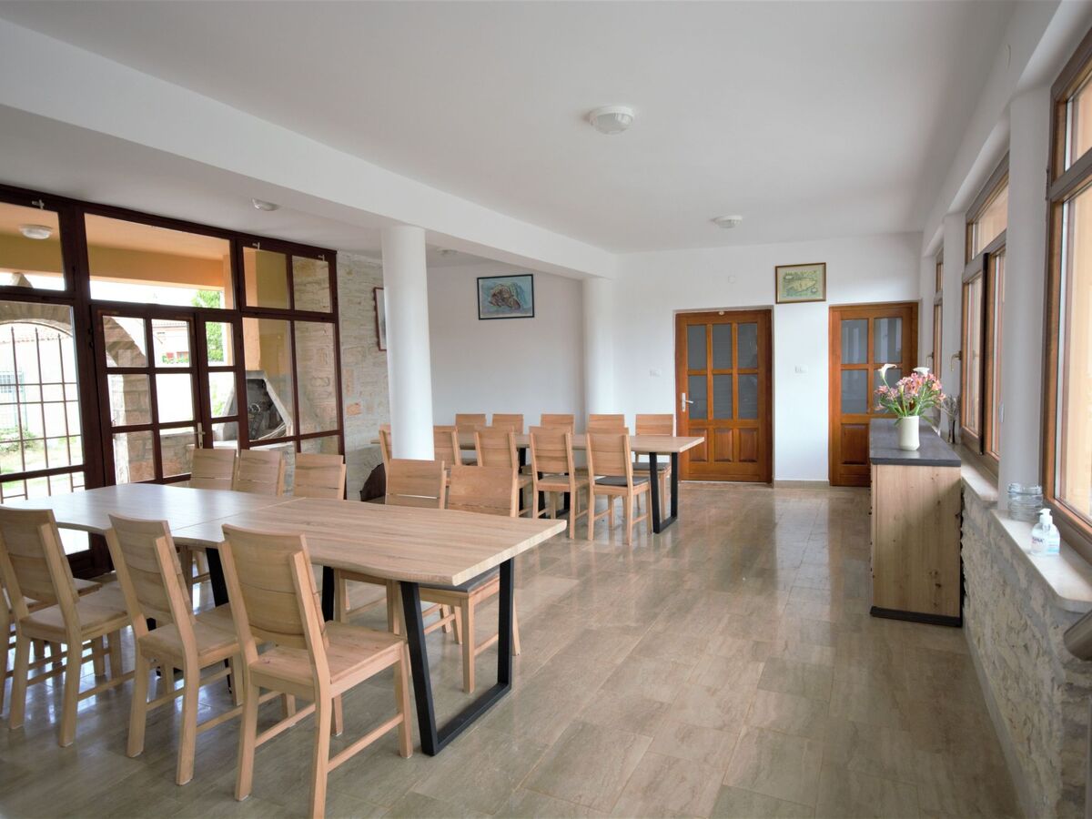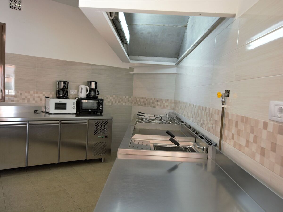 The ground floor features a fully equipped professional kitchen, boasting a stove, oven, microwave, and coffee maker, alongside a large dining room with seating for 20 people, complete with a cozy fireplace.