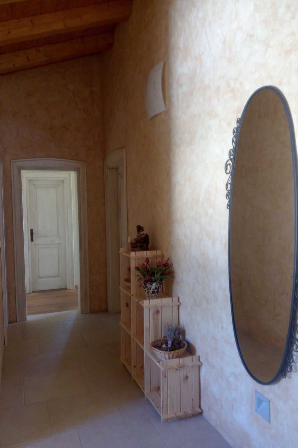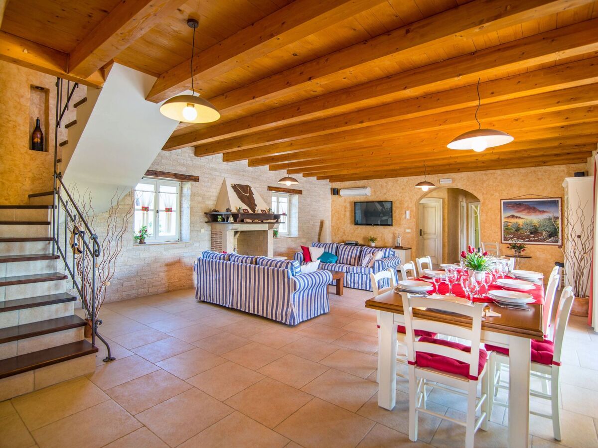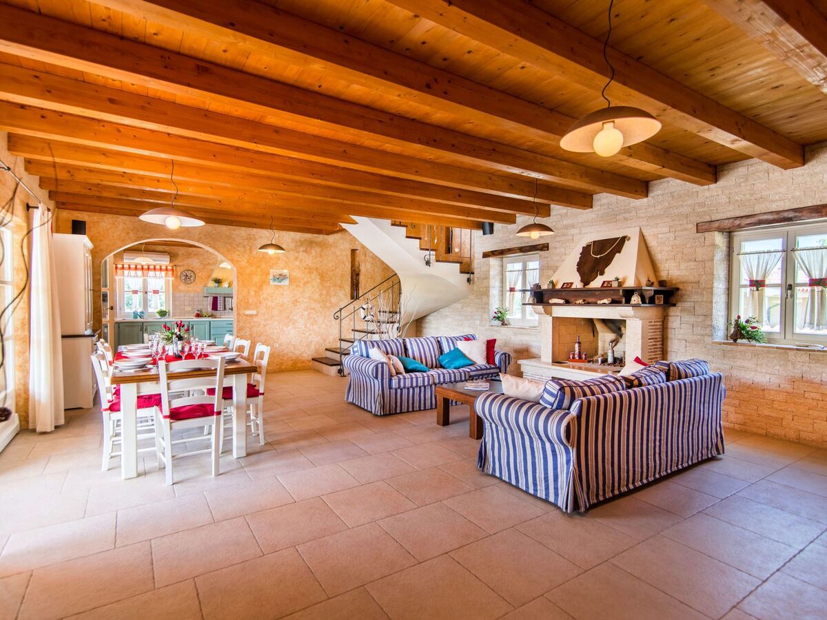 À l'intérieur, la villa dispose d'un rez-de-chaussée spacieux et élégant, où des poutres en bois et une charmante cheminée créent une atmosphère chaleureuse et accueillante.