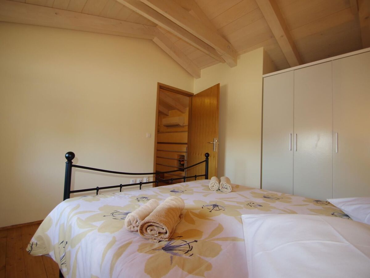 A wooden internal staircase leads to the two double bedrooms on the upper floor, which are furnished with double beds.