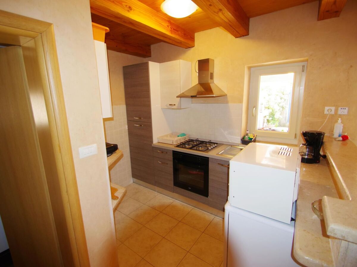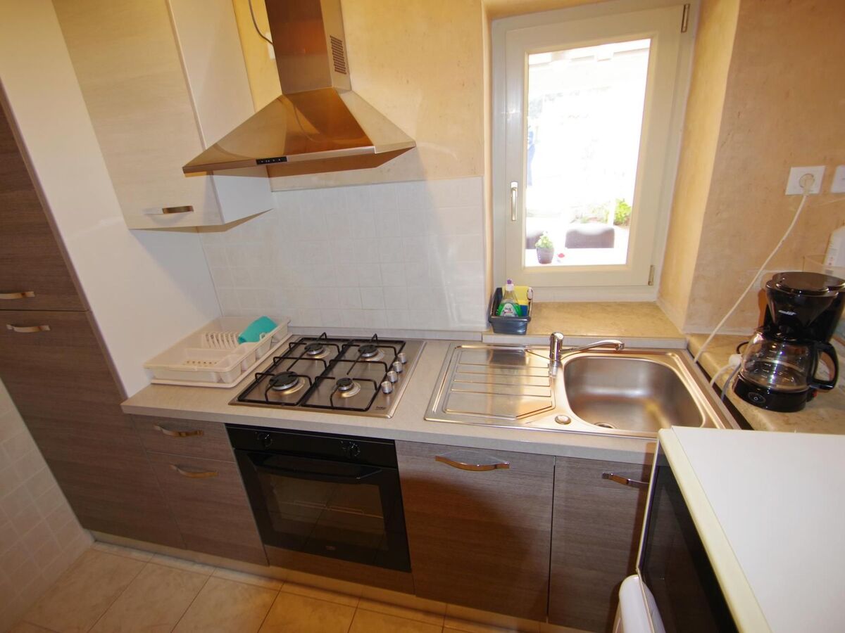 The kitchen is fully equipped with a 4-burner gas hob, fridge with freezer compartment, microwave, coffee machine, dishwasher, oven, toaster and air extractor above the hob.