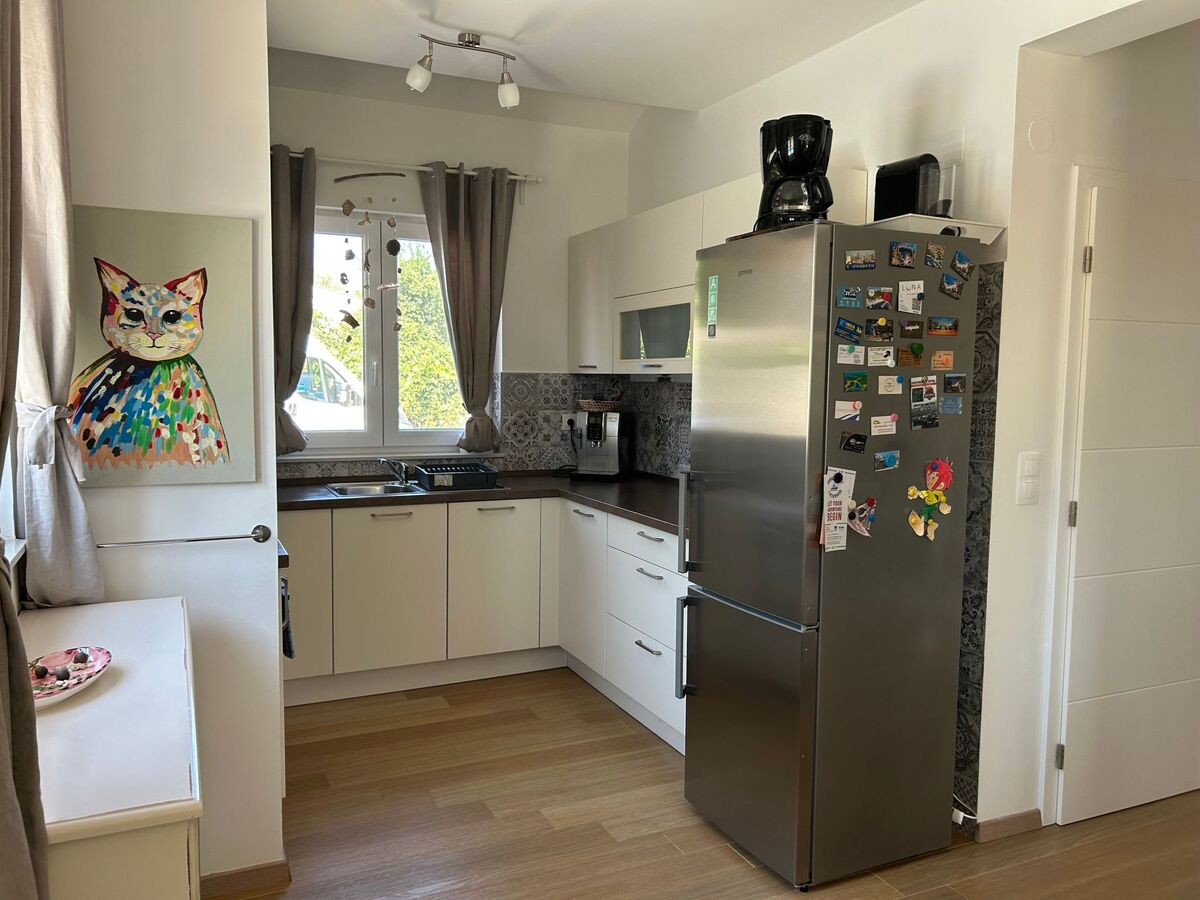 Im Erdgeschoss befindet sich ein schöner, heller voll klimatisierter Raum im offenen Konzept der das Wohnzimmer mit dem Esszimmer und der komplett ausgestatteten Küche (Backofen, Geschirrspüler, 4 Glaskeramikherd Platten, Mikrowelle, Tiefkühler, Kaffeemaschine, Wasserkocher) verbindet, außerdem befindet sich hier eine Gästetoilette mit Tageslicht und Waschmaschine.