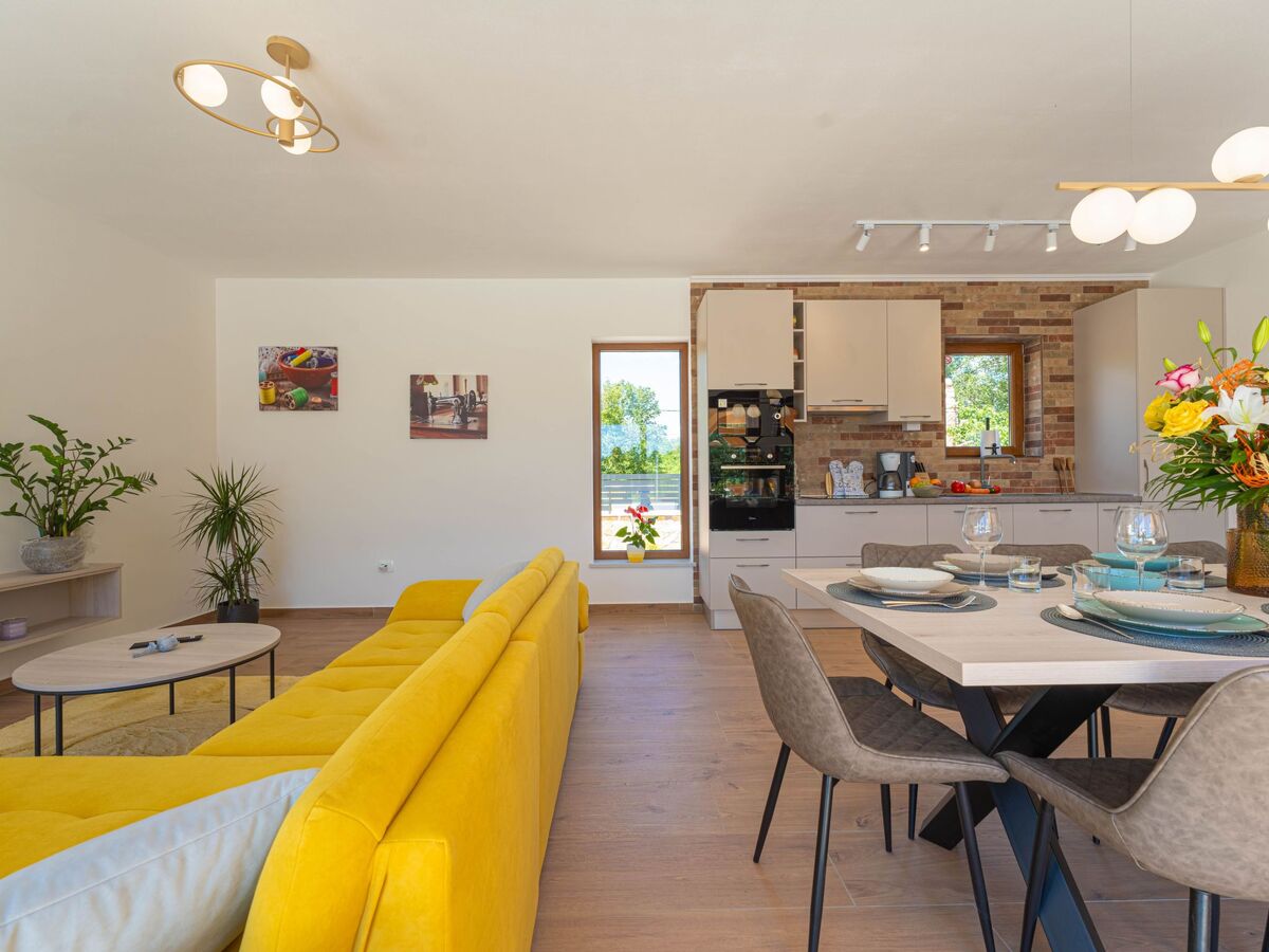 - open space living room with dining area and kitchen, access to the terrace from the living room