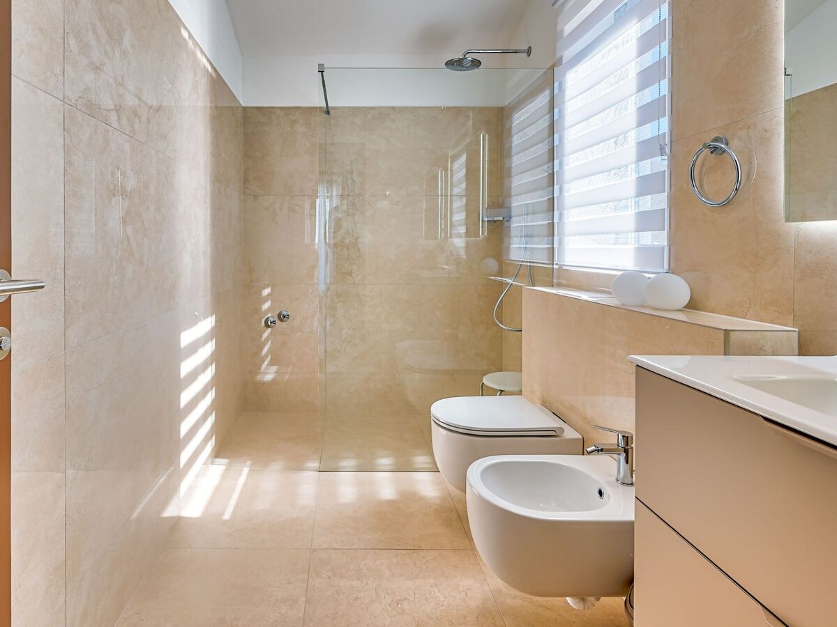 On the ground floor there is a big living room with additional TV, a dining room, a fully equipped kitchen and a guest restroom, all air conditioned.