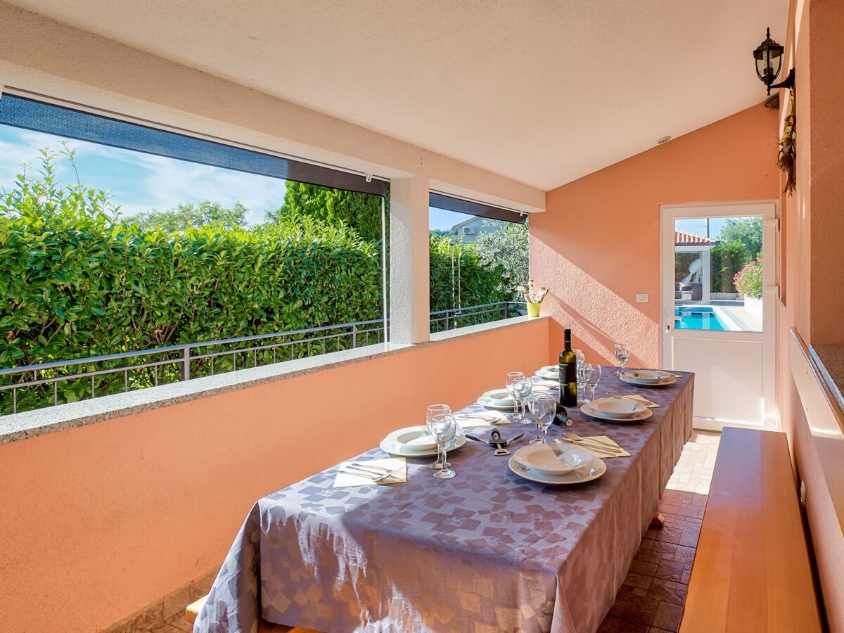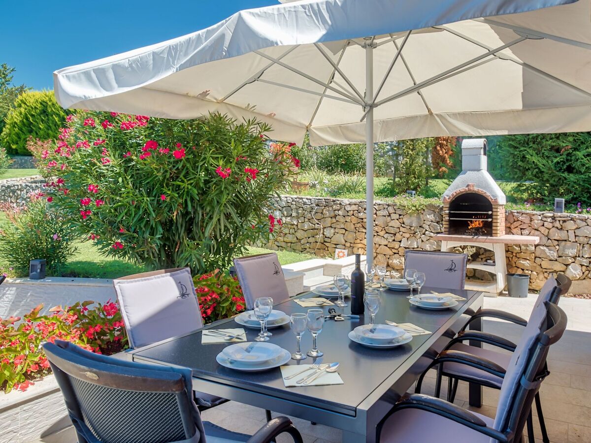 There is a roofed terrace next to the house, where up to ten people can sit at the dining table and prepare meals on the grill.