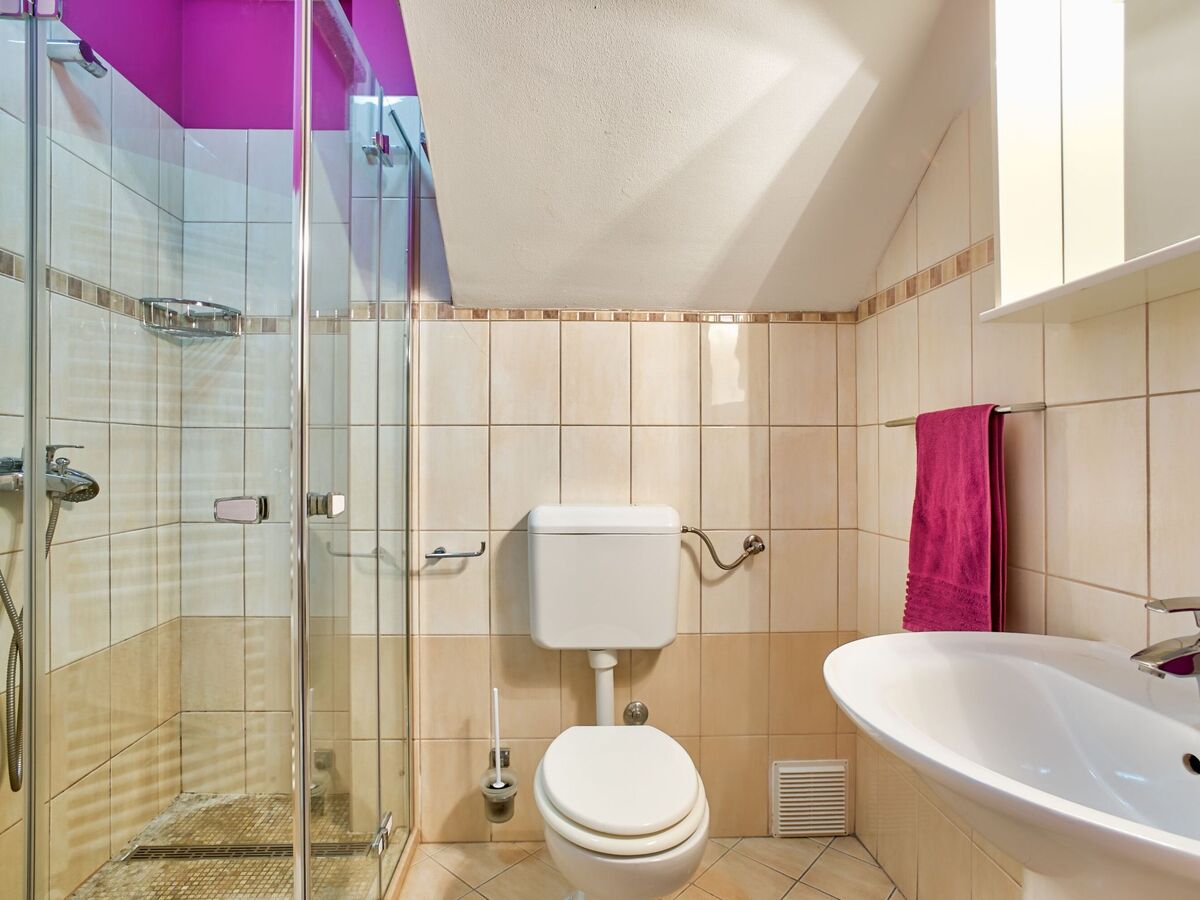 There are two further bedrooms, each with a double bed measuring 180 x 200 cm, as well as a private bathroom on the upper floor.