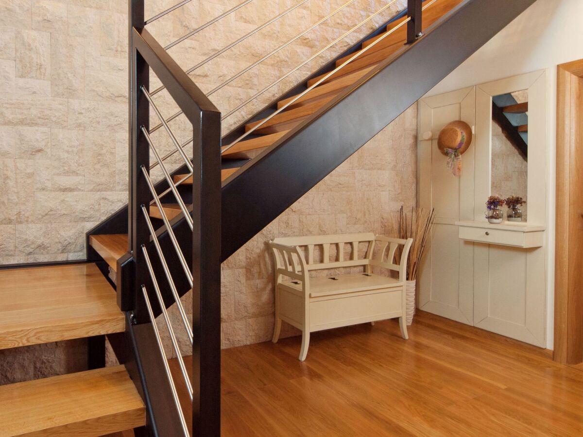 Wide stairs lead to the upper floor with the bedrooms and bathrooms.