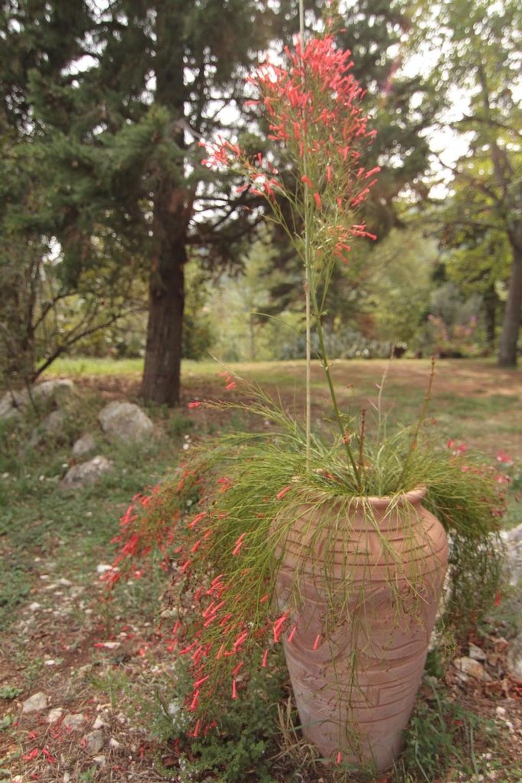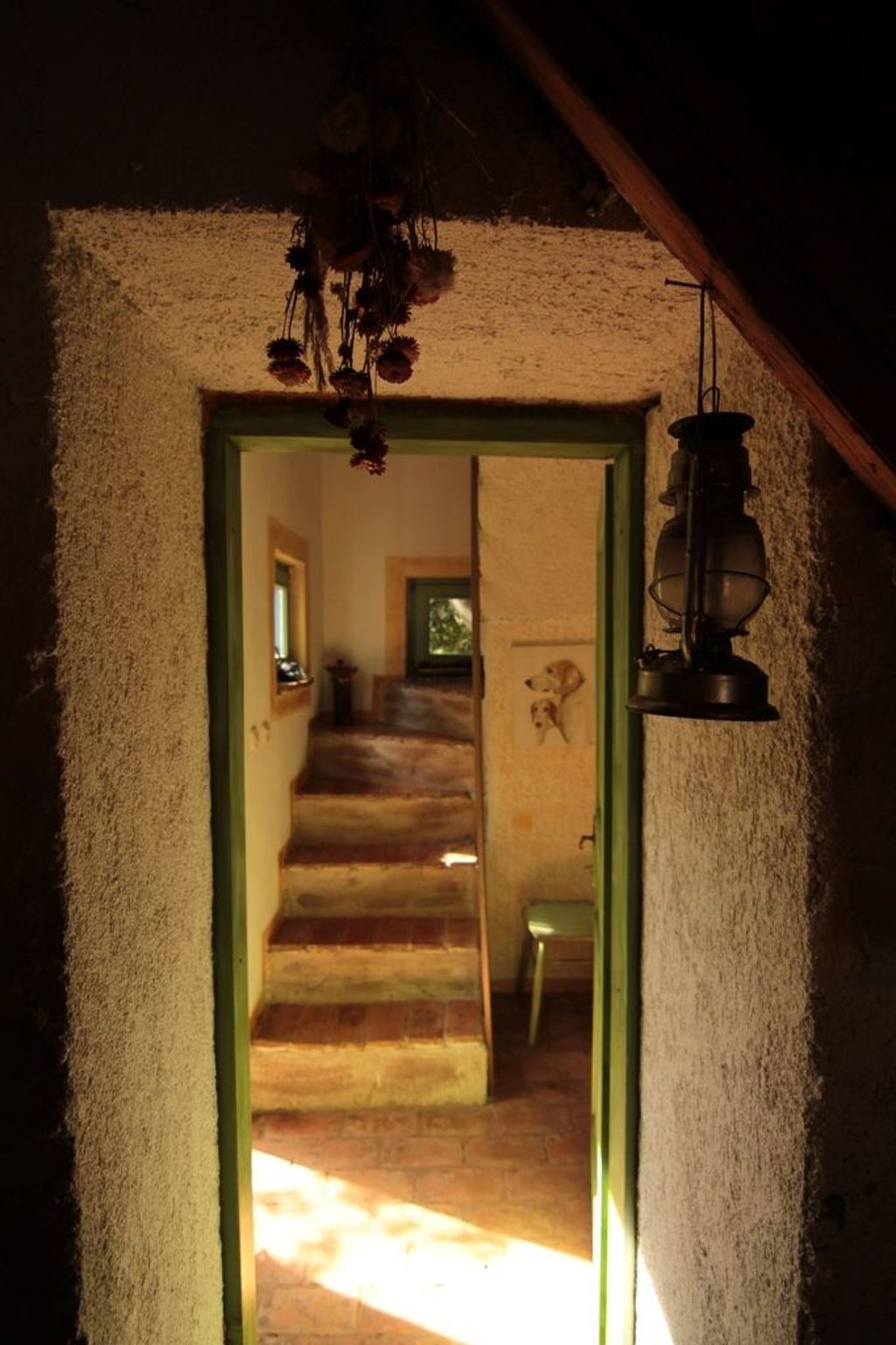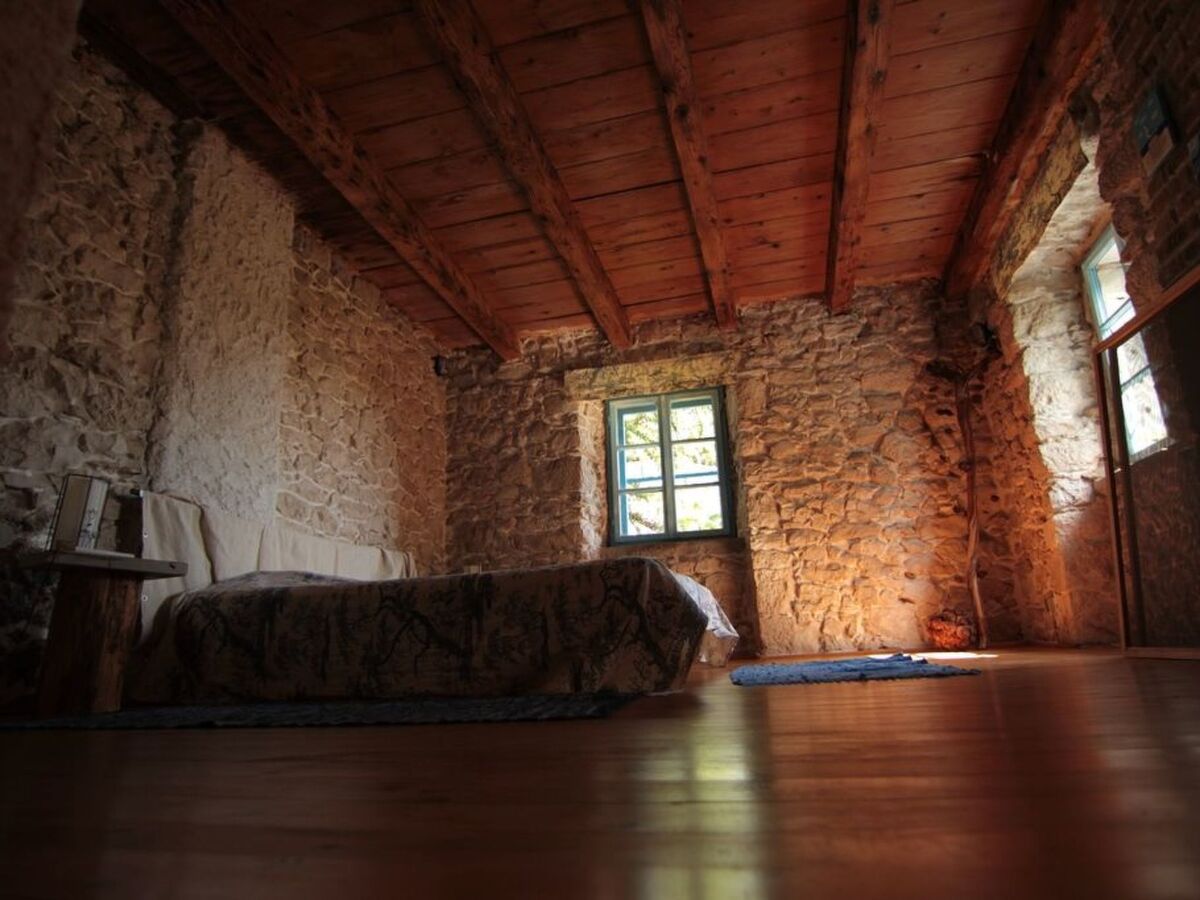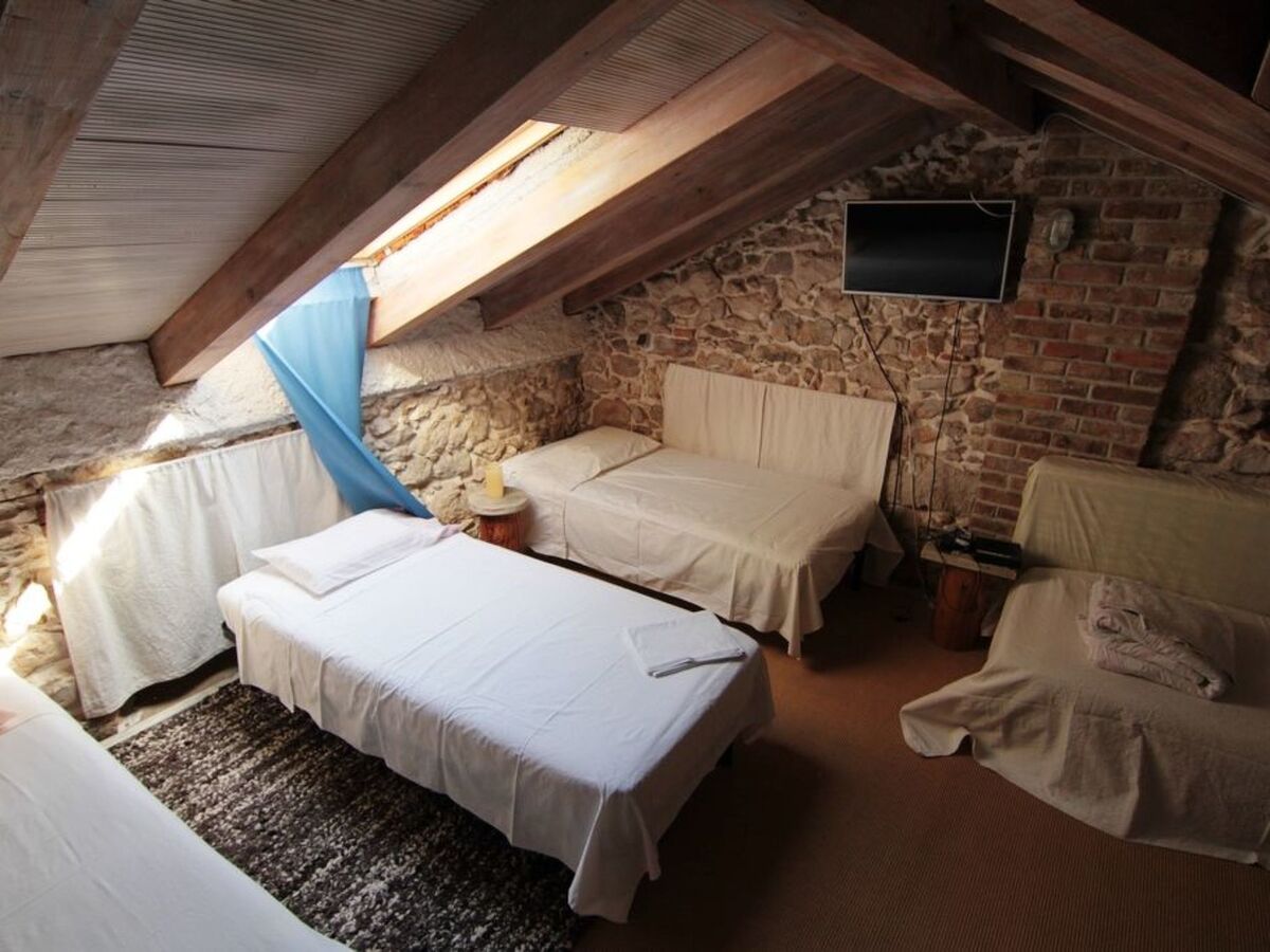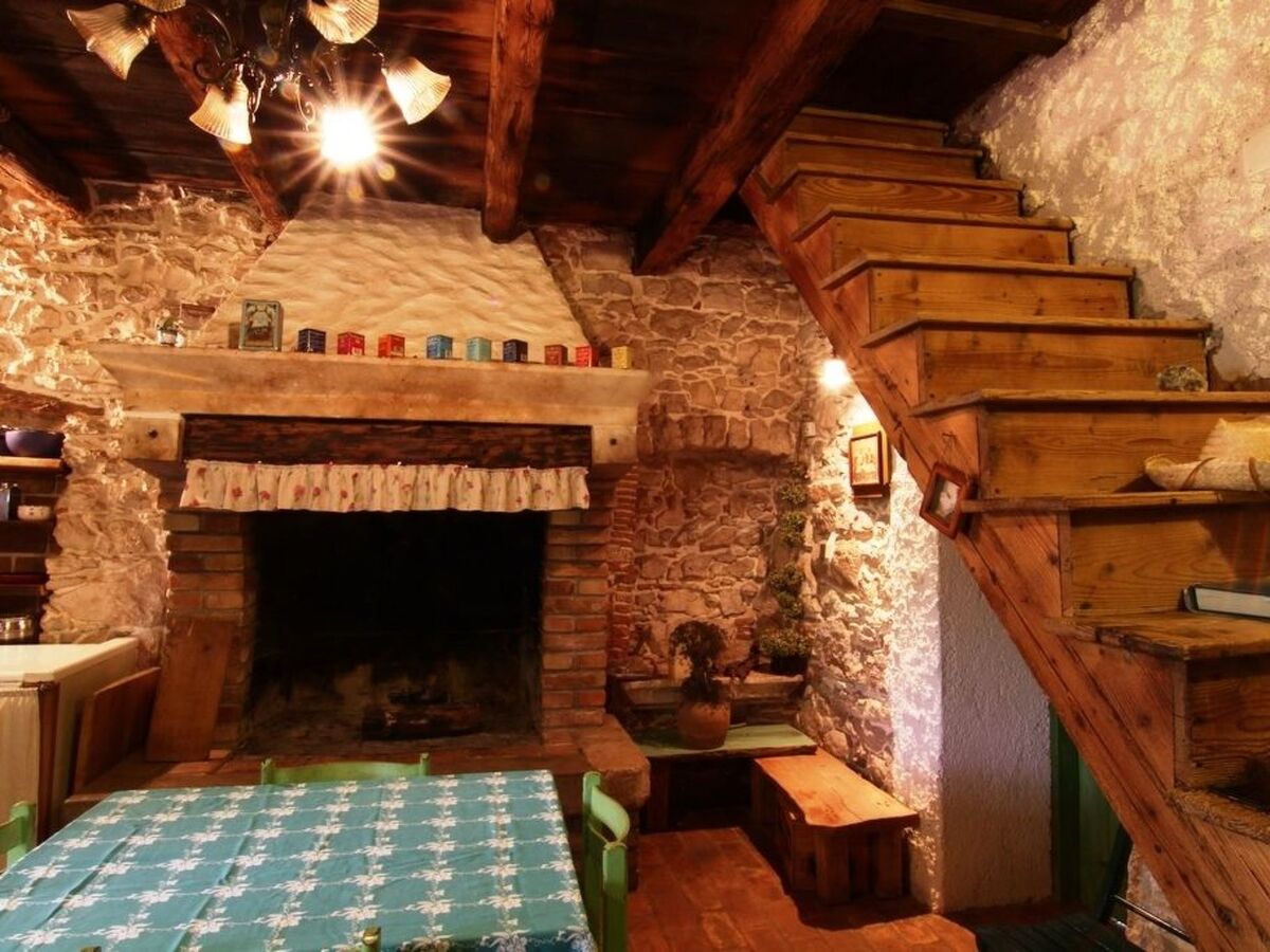 The large stone fireplace stove built into the wall enhances the rustic country house atmosphere and provides homely warmth on cooler evenings.