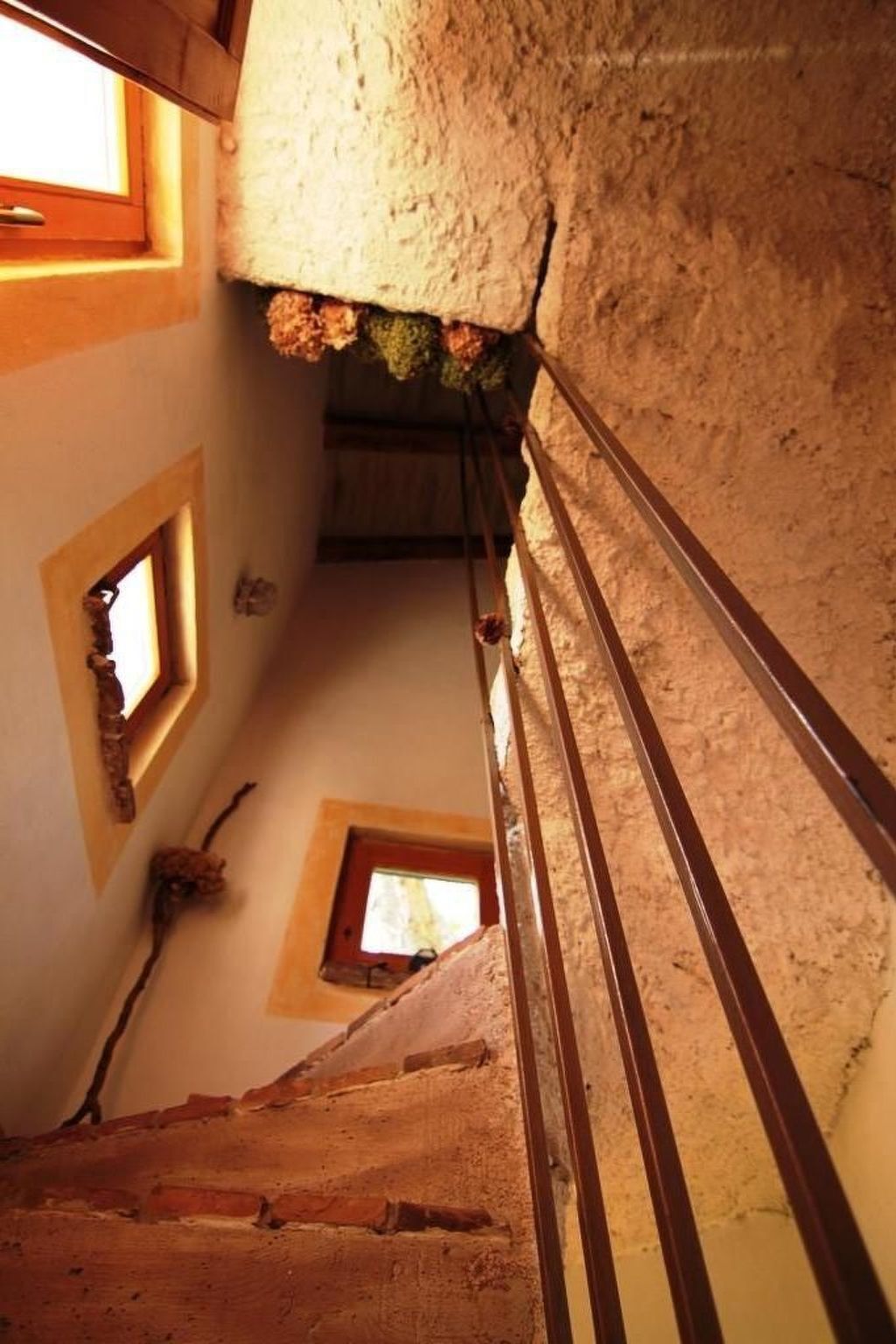 Wide, rustic, wooden stairs lead to the upper floor with the two bedrooms and the two further bathrooms.