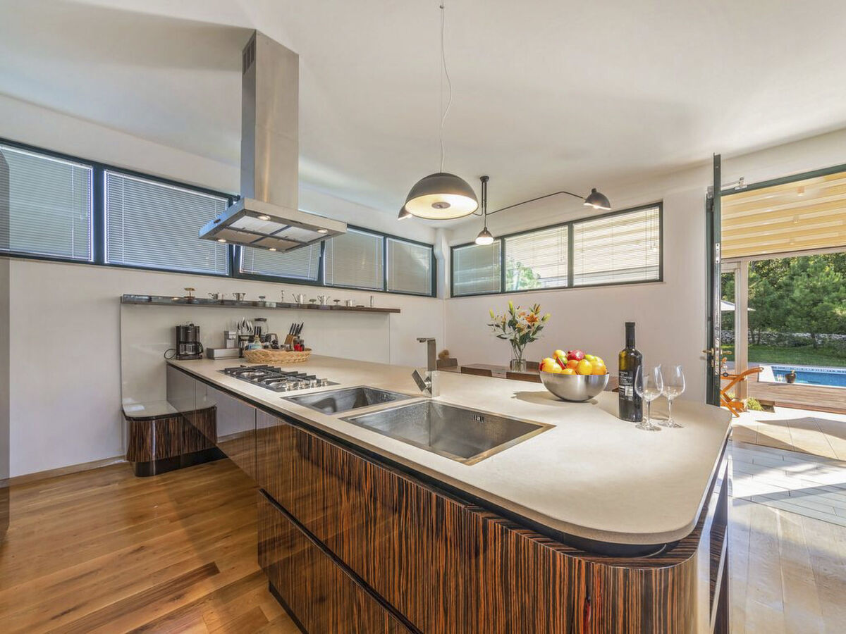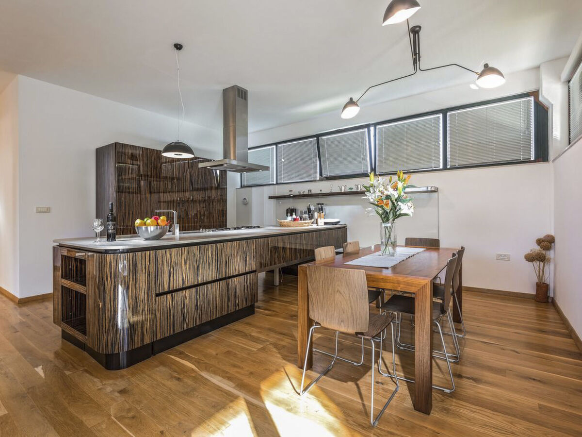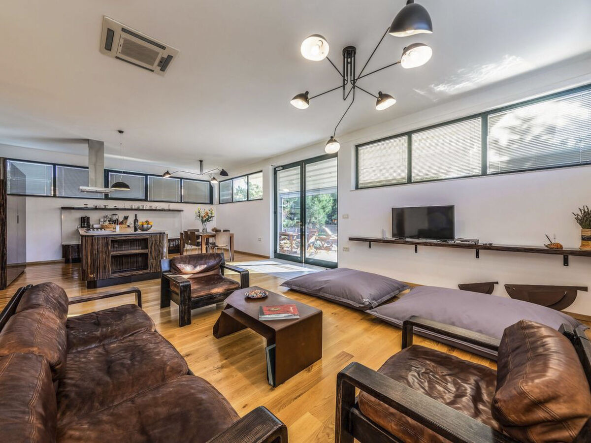 Open-plan living room with luxurious Italian kitchen and state-of-the-art appliances.