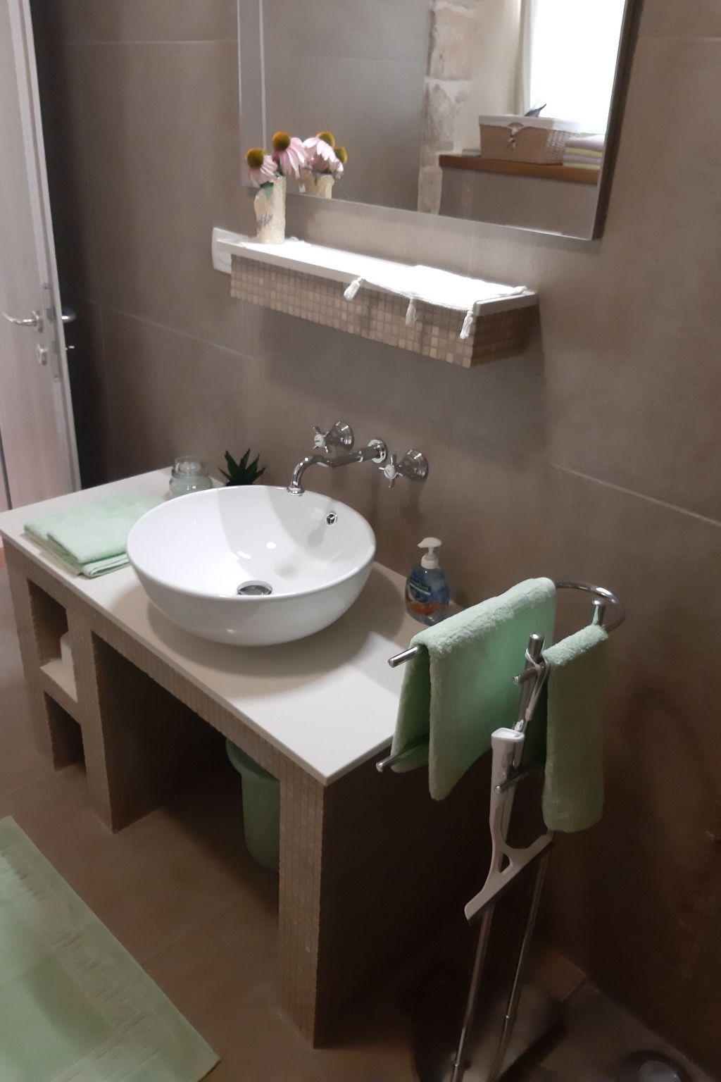 The ground floor is home to a traditional, fully equipped kitchen, a dining room, and a living room, as well as a bathroom, while the first floor houses the bedrooms and a balcony.