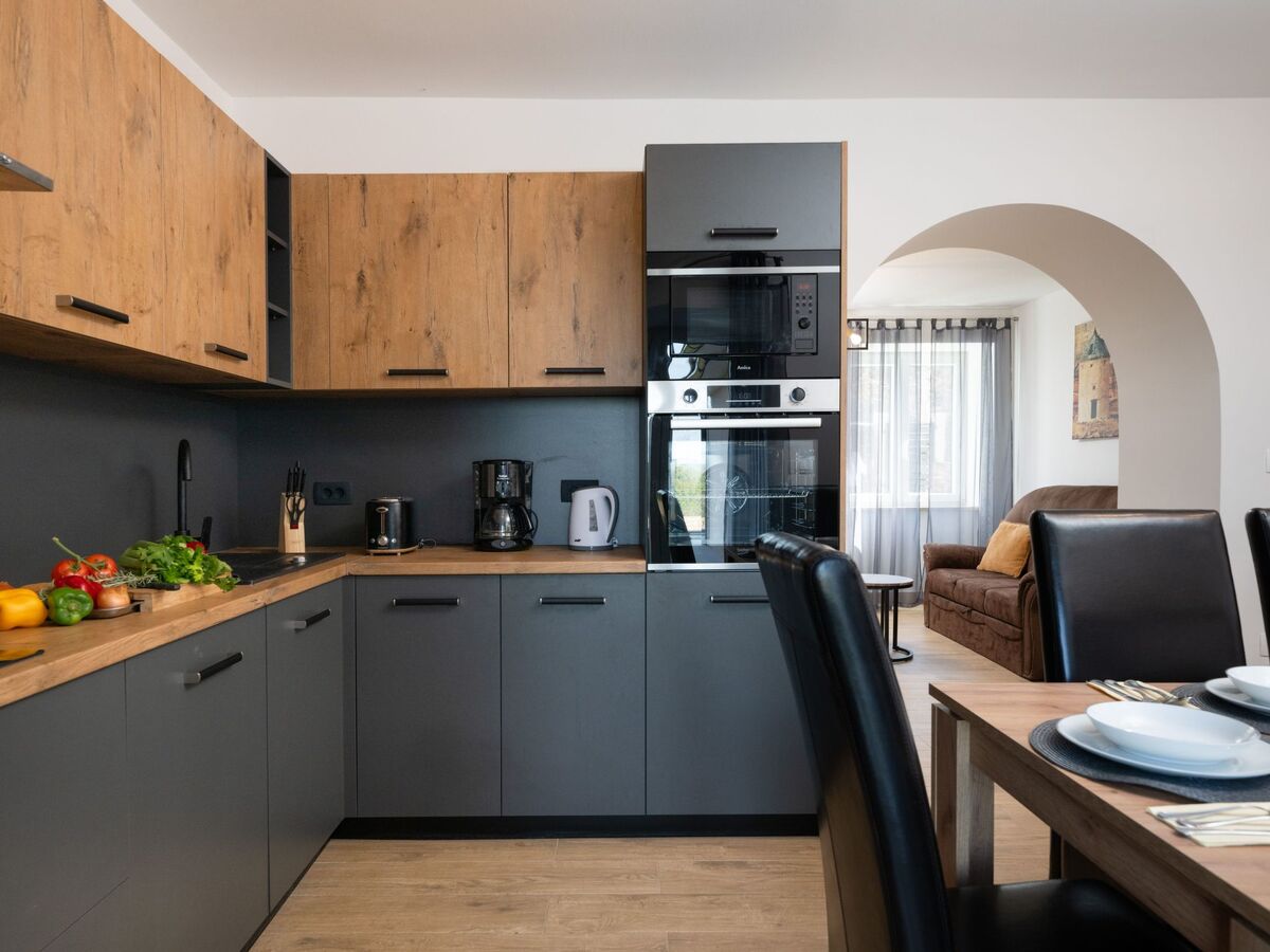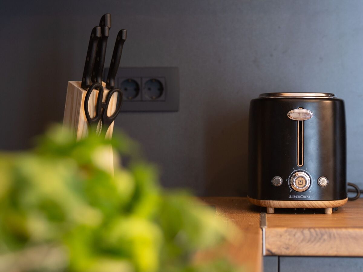 Kitchen equipment: 4 cooking rings (electrical ring), air hood, oven, refrigerator with freezing section, filter coffee machine, dishwasher, kitchen utensils, water boiler, microwave, toaster.