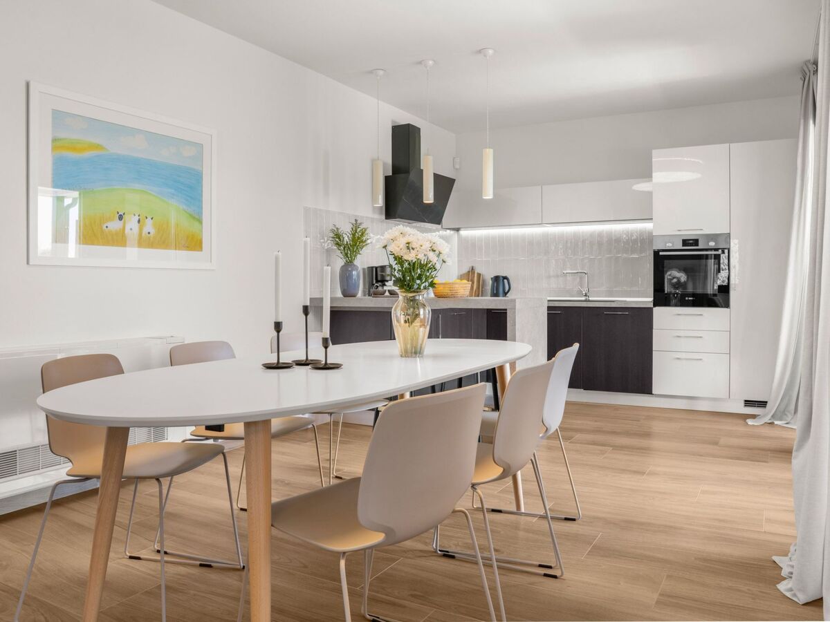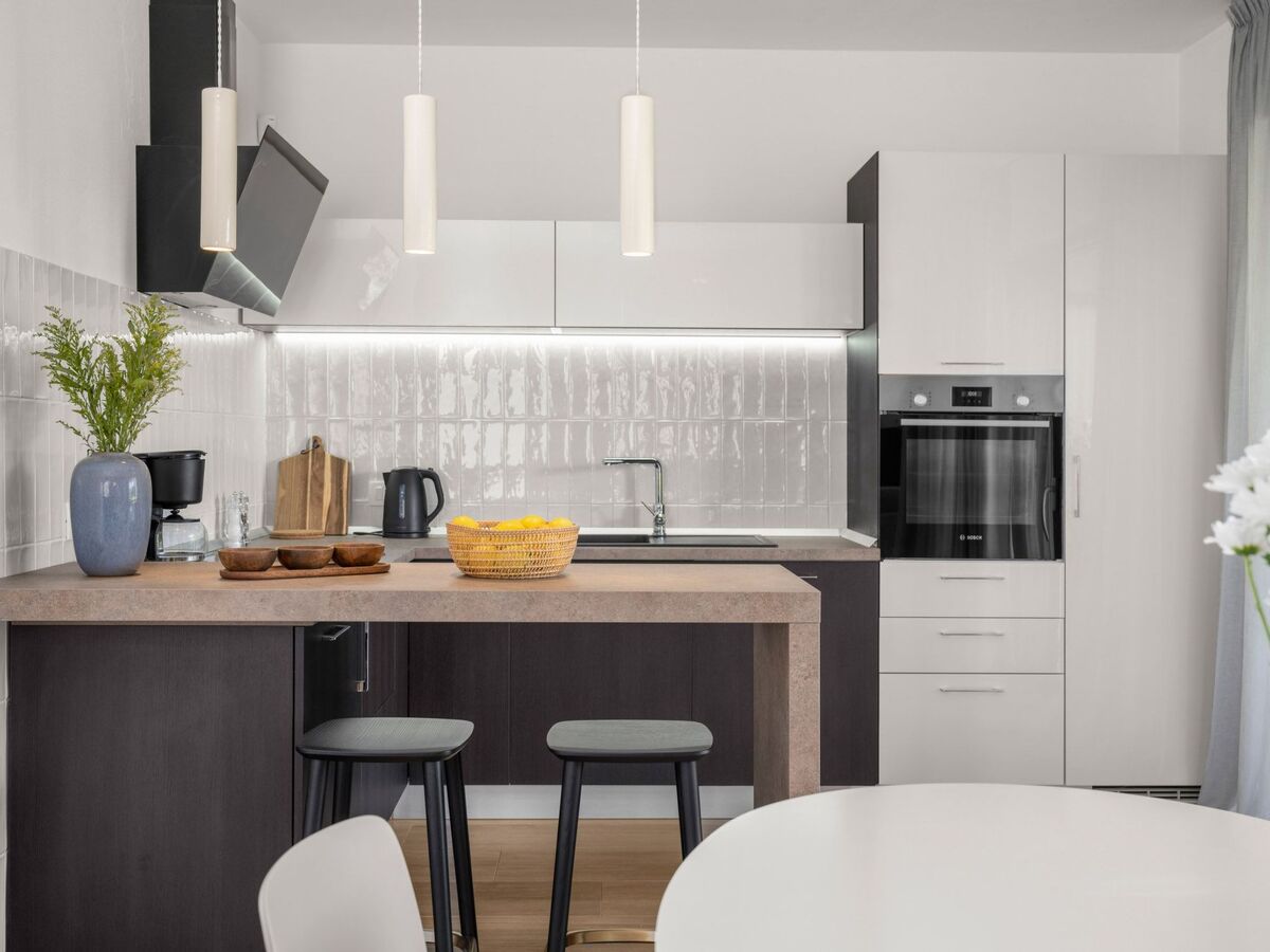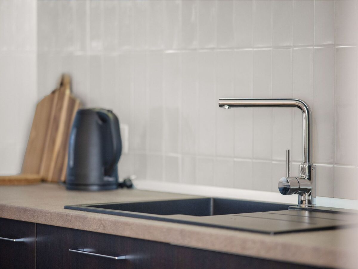 Au rez-de-chaussée se trouve une cuisine moderne entièrement équipée : plaque vitrocéramique, cafetière à filtre, machine à café à capsules, lave-vaisselle et bouilloire.