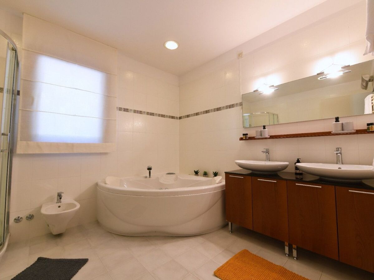 It's first floor bathroom has a big whirpool bath and two sinks.