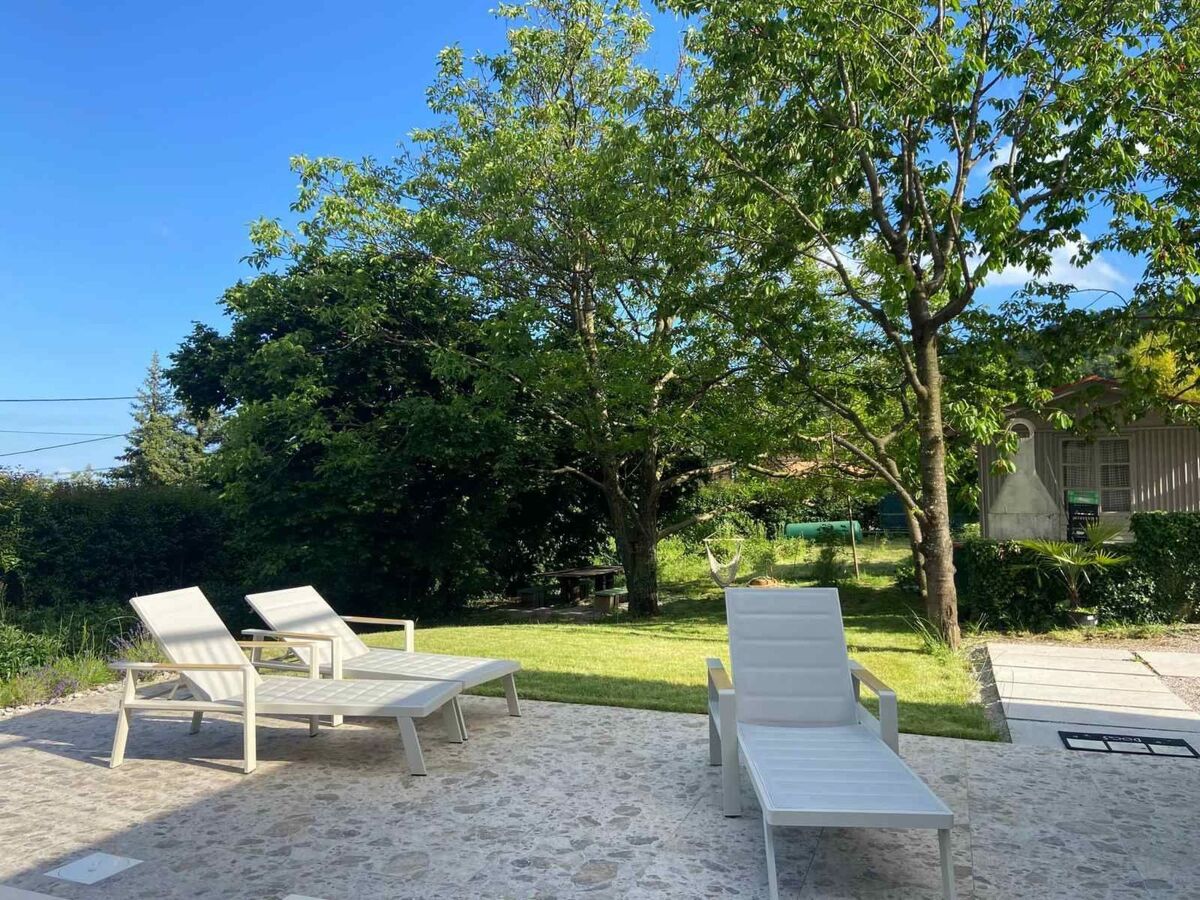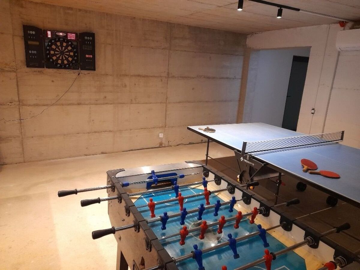 The outdoor facilities next to the swimming pool includes a barbecue with a large dining table, deckchairs, a sauna with a bathroom and some outdoor games.