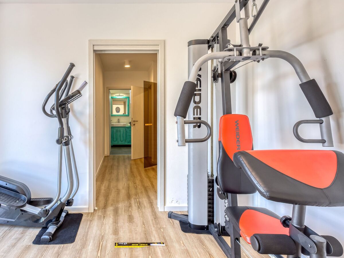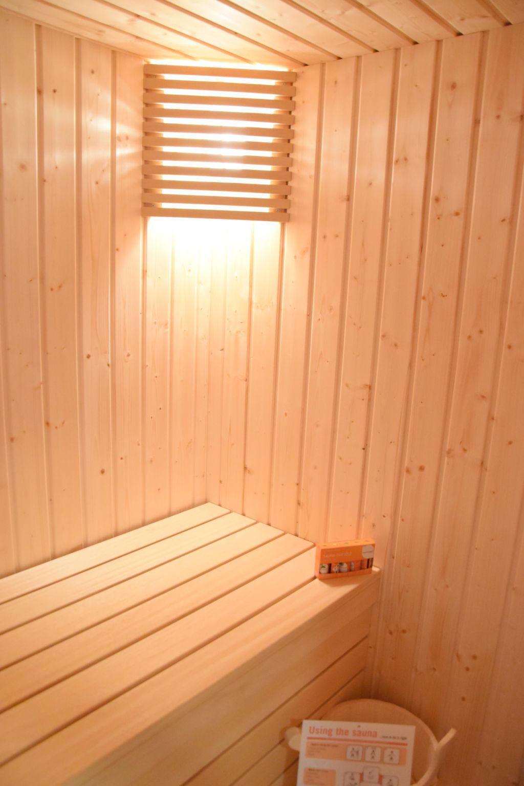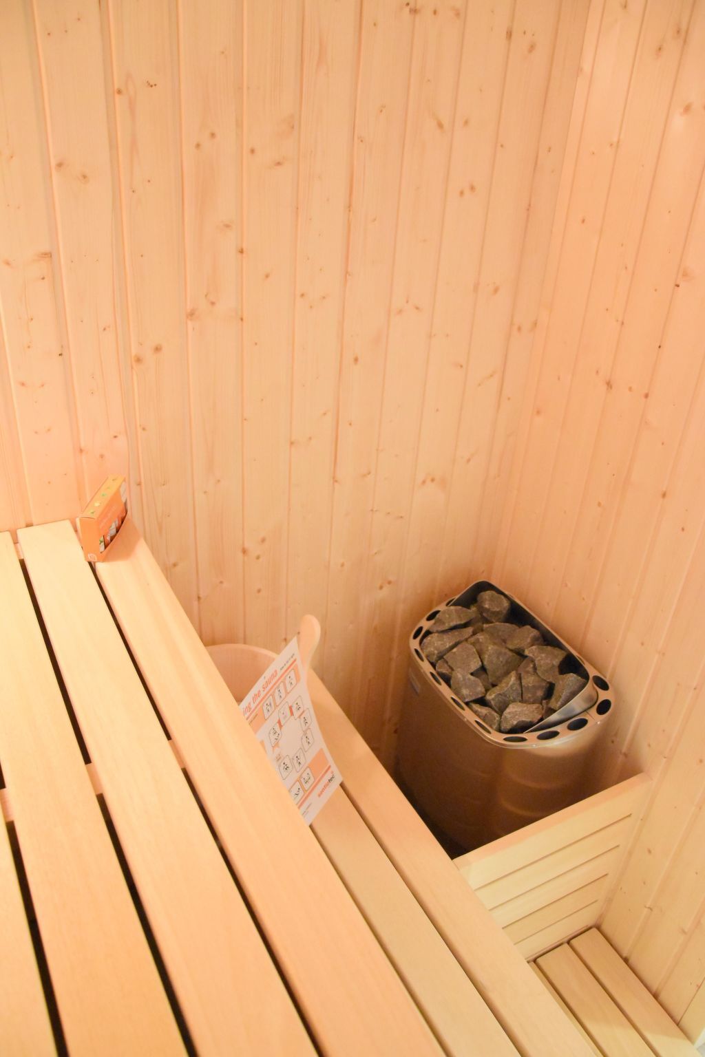 The ground floor has a living room, kitchen with dining area, bathroom, toilet, sauna, fitness room, laundry.