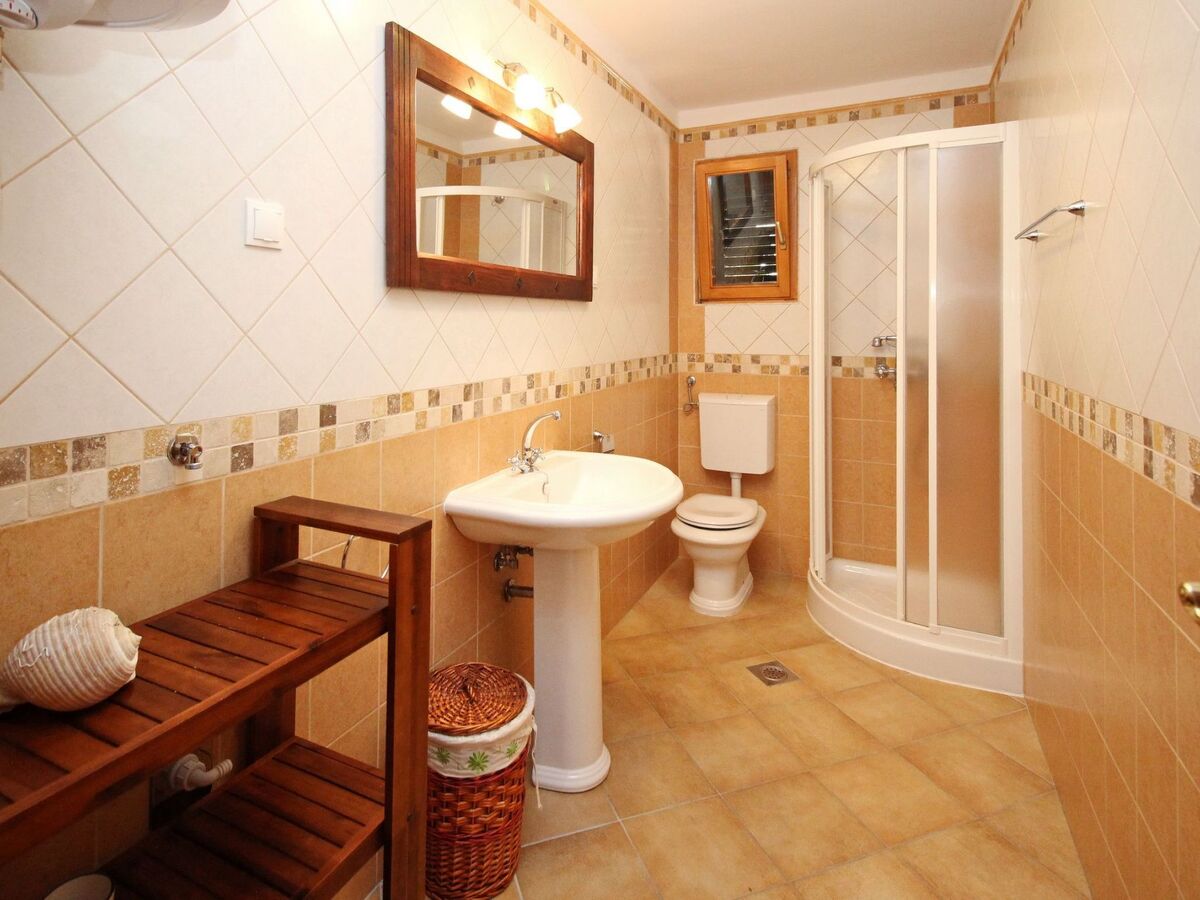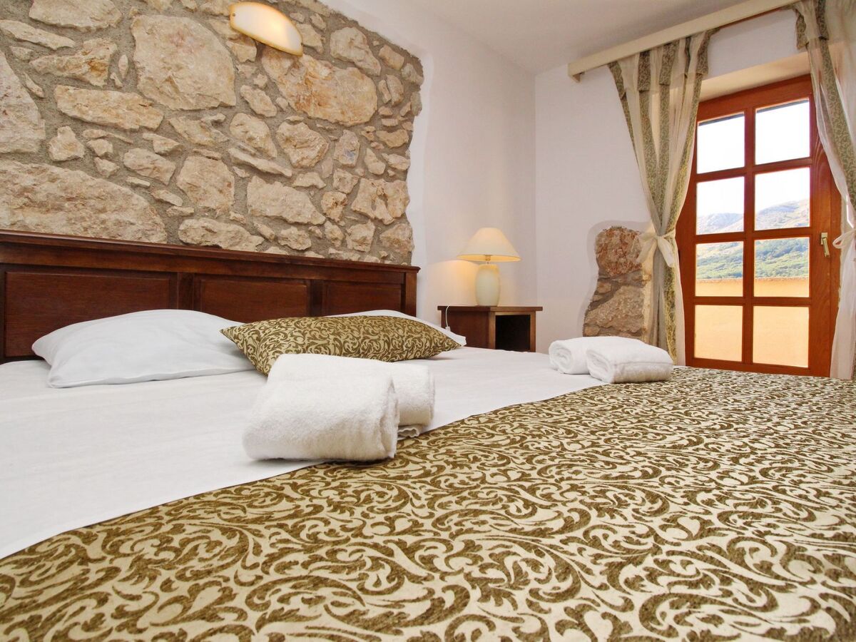 From the centre of Baska about 4 km away but in Baska free parking near the beach Other options: Air conditioning, Internet included in price, pleasant surroundings, flat with pool, free Wi-Fi Number of persons: 8-9 Places: 200 m2 (On two floors) Check in: 14:00 Check out: 10:00 Equipment of holiday house for single use: Bedroom no.1 : double room , double bed , with balcony , parquet , Bedroom no.2 : double room , double bed , parquet Bedroom no.3 : double room , double bed , parquet Bedroom no.4 : double room , double bed , parquet Bedroom no.5 Living area : separate living room; separate dining room; dining table and seating for all persons; with terrace; tiled Kitchen :kitchenette, crockery, cooking pots, cutlery etc.