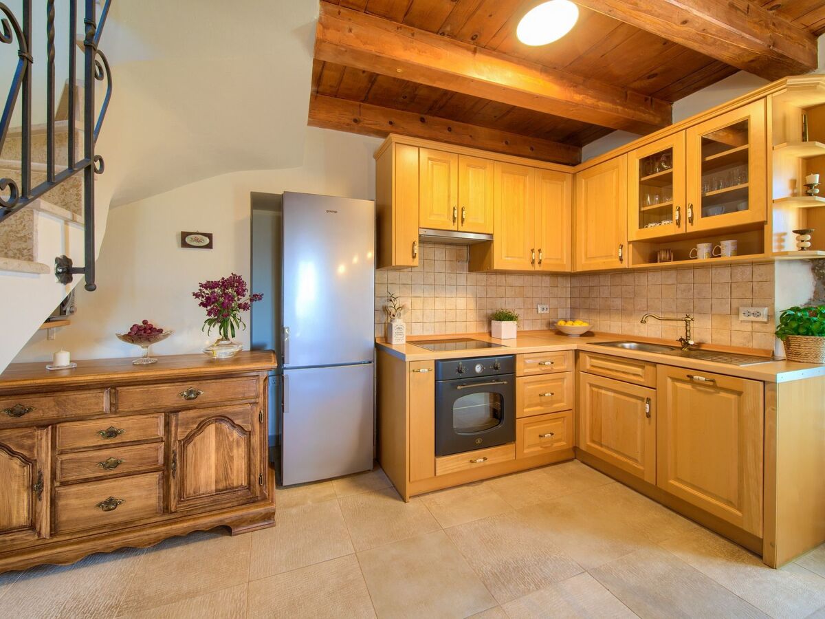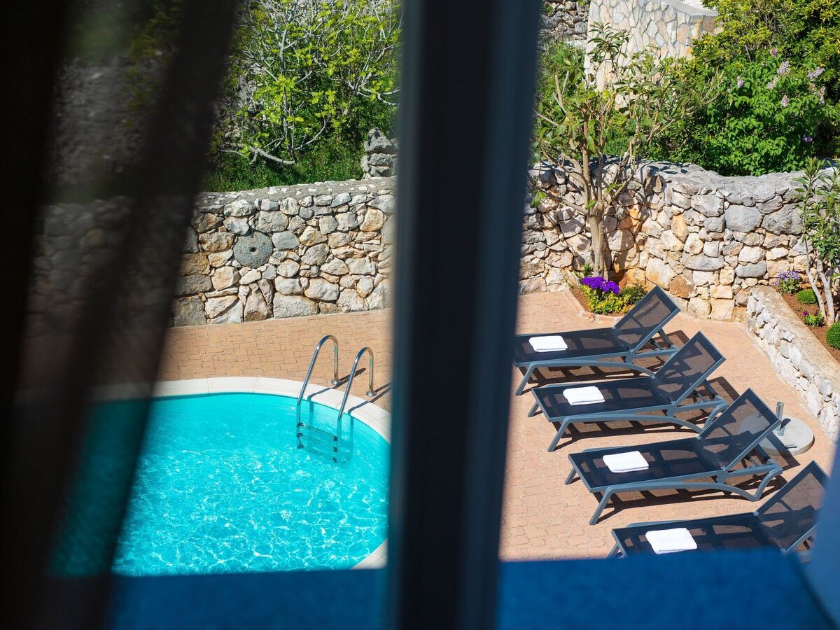 It features sun loungers perfect for basking in the serene surroundings, a pool to refresh on sun-drenched days, and is adorned with olive trees, oleander, and Mediterranean flowers.