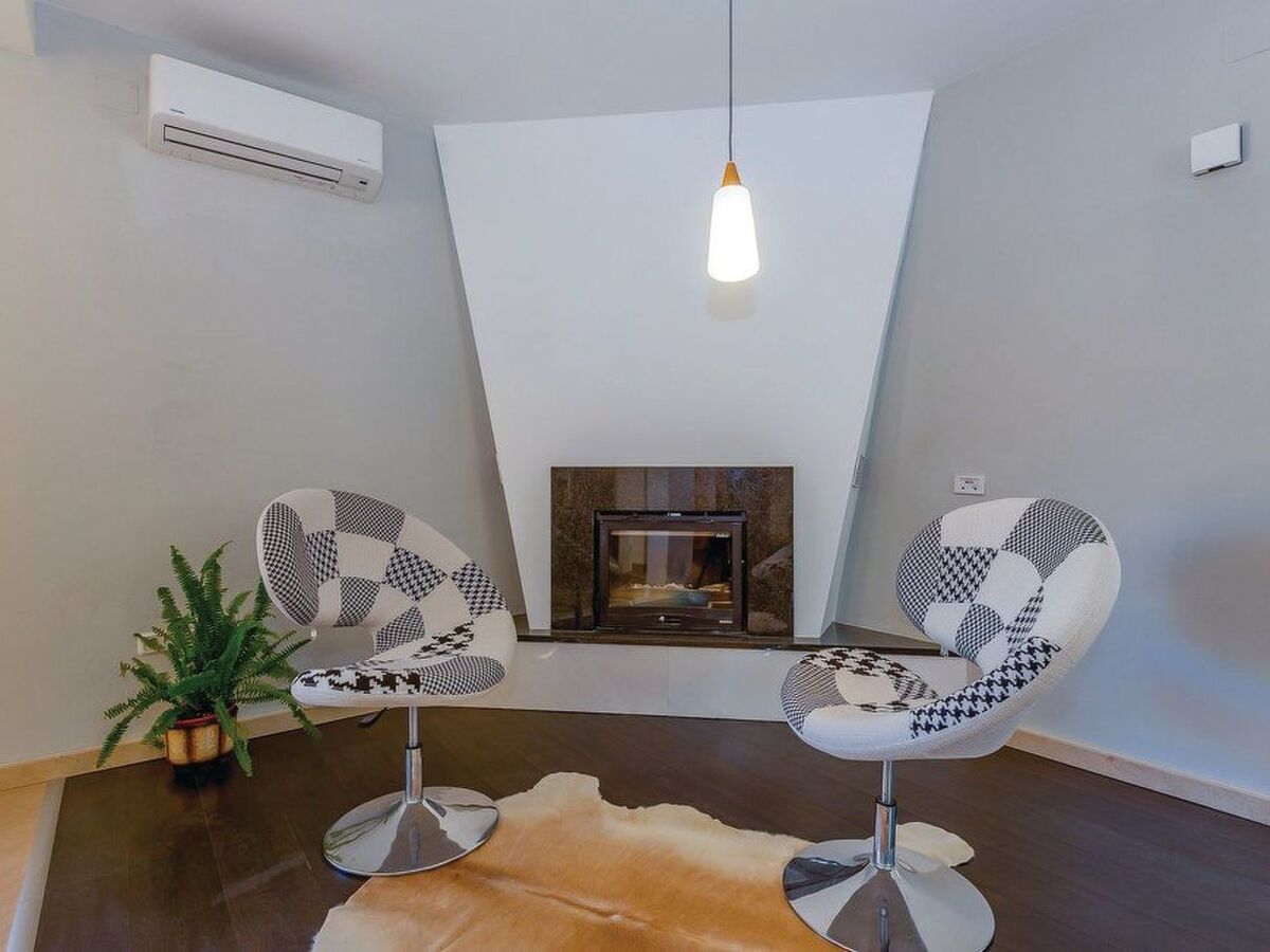 The ground floor is about 75 m² in size and comprises of the following rooms: A living room with a fireplace, a two flatscreen TV and a double sofa bed (there can also sleep two extra persons).