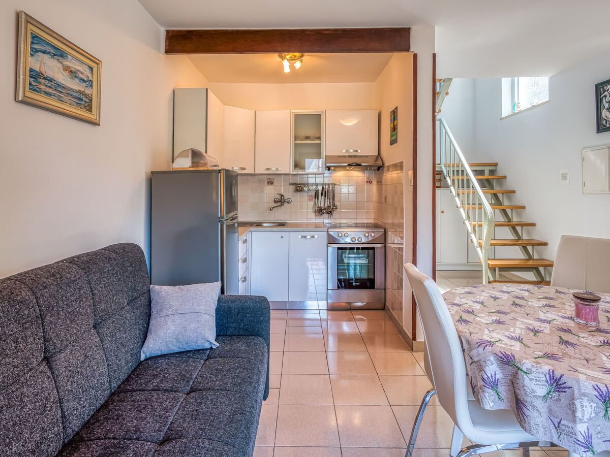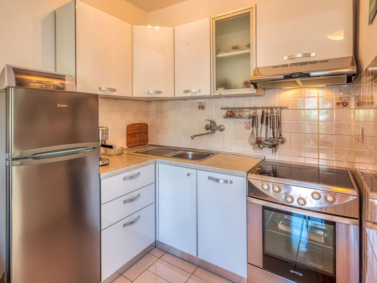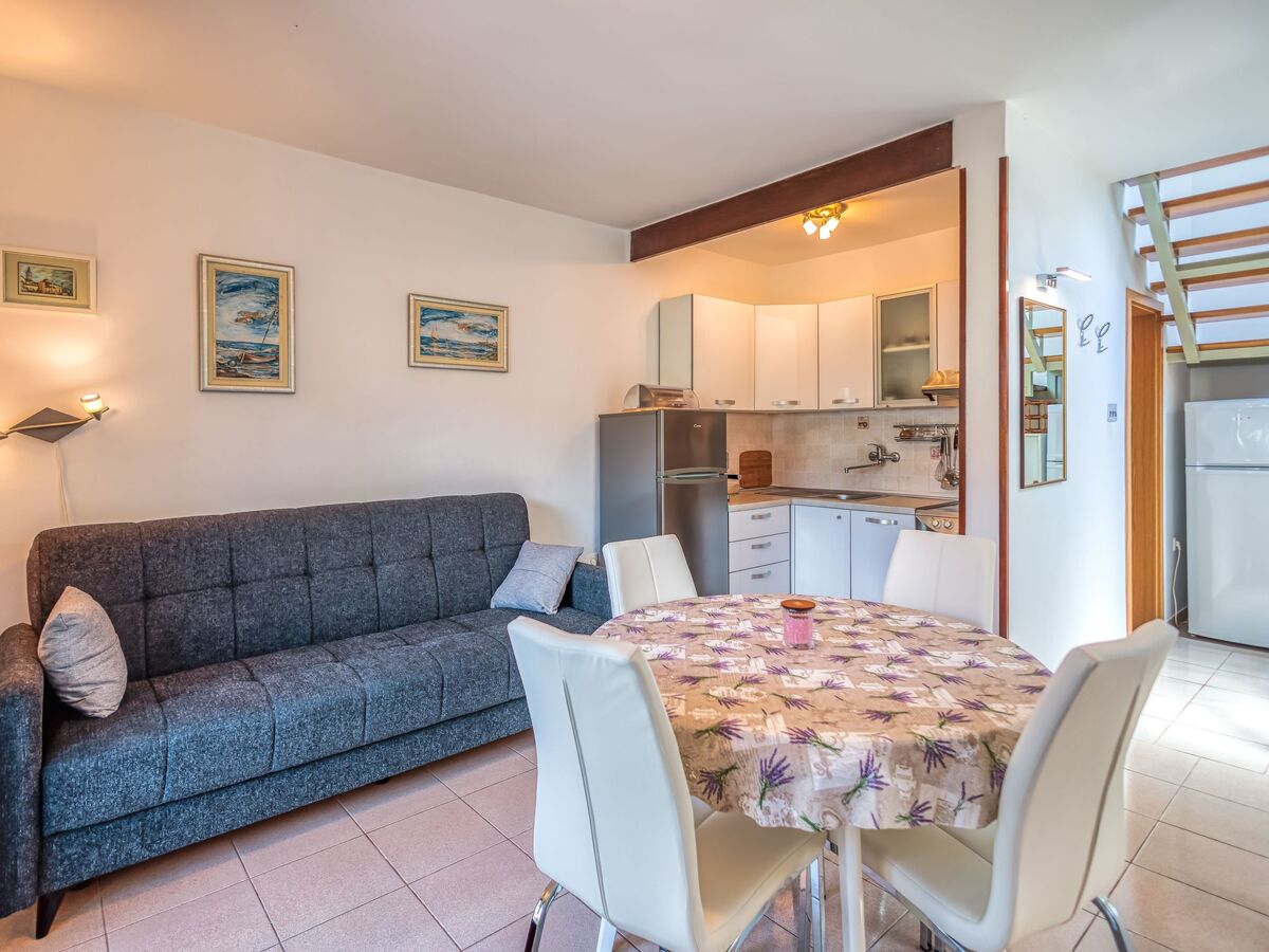 The air-conditioned living room comprises a comfortable sitting area with a leather sofa, a TV and a dining table, as well as an open cooking corner equipped with a stove, oven, coffee machine, fridge and espresso pot.