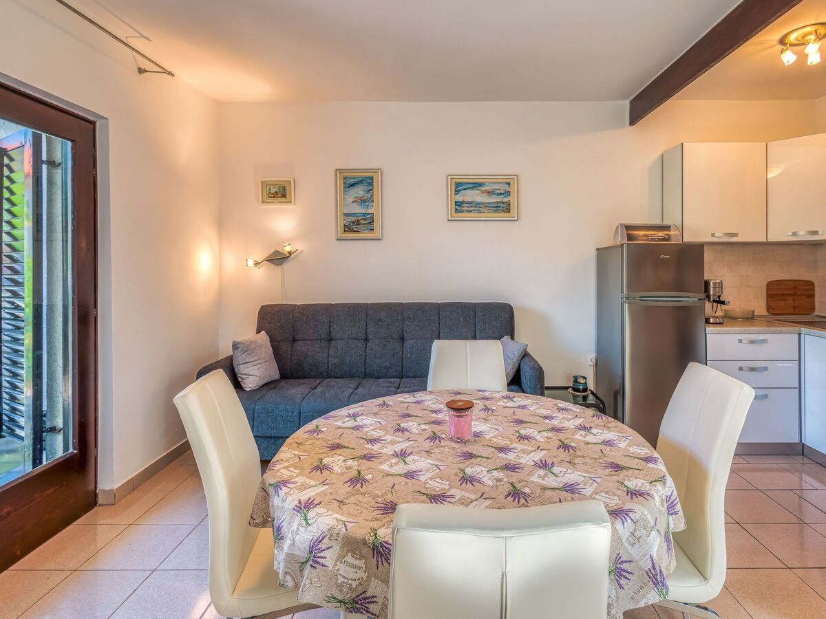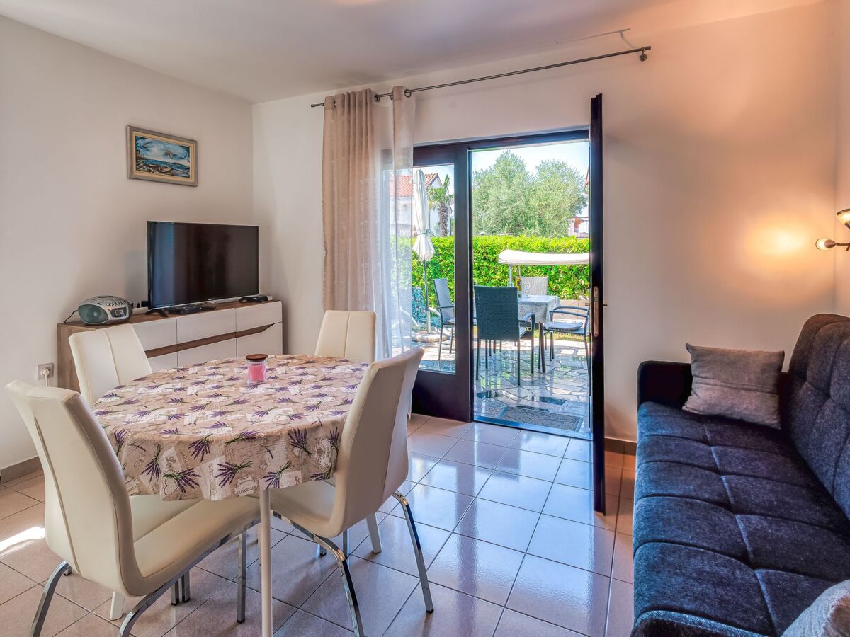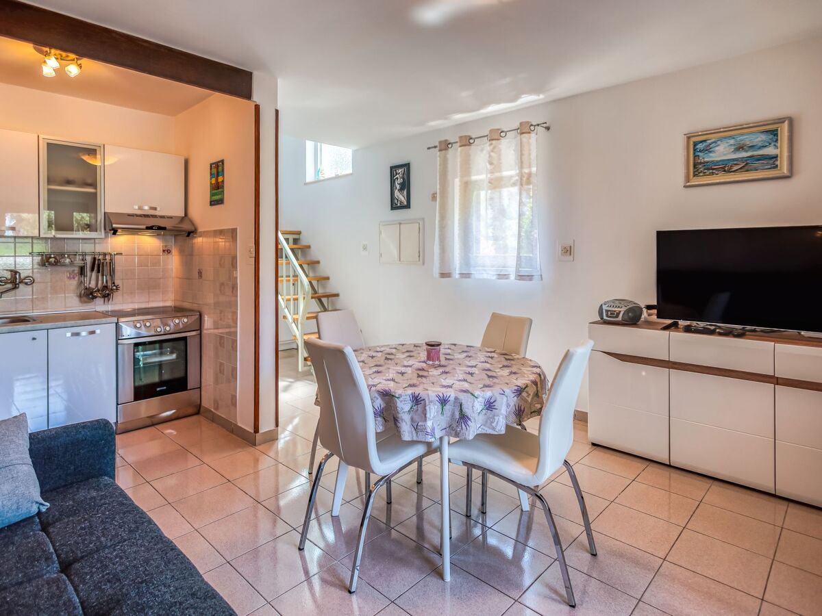 The air-conditioned living room comprises a comfortable sitting area with a leather sofa, a TV and a dining table, as well as an open cooking corner equipped with a stove, oven, coffee machine, fridge and espresso pot.