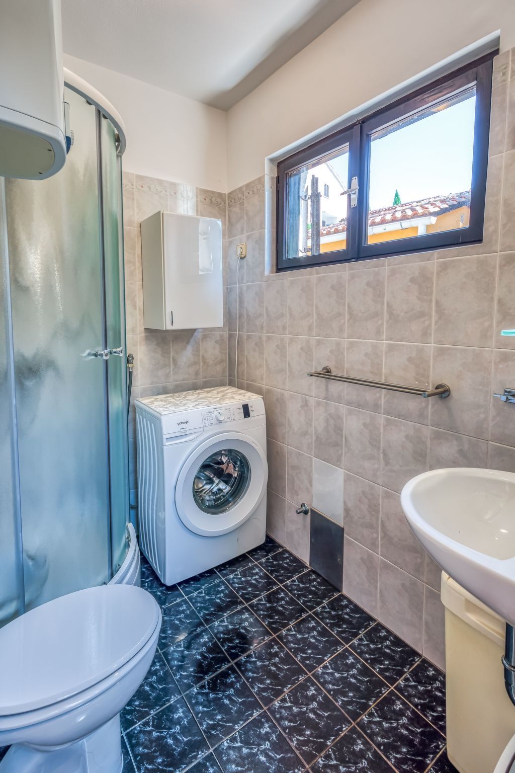 Bathroom has light tiles and is fitted with a shower, WC, hairdryer and washing machine.