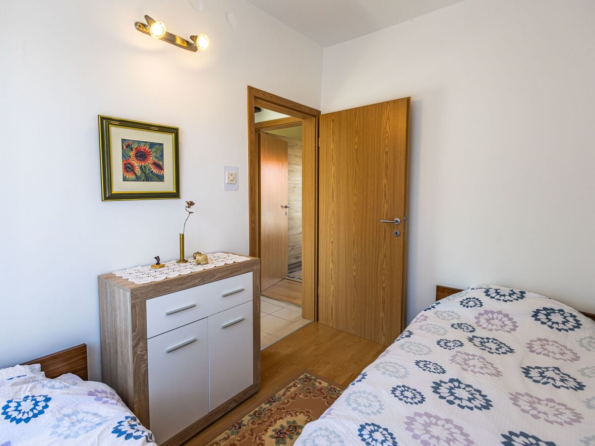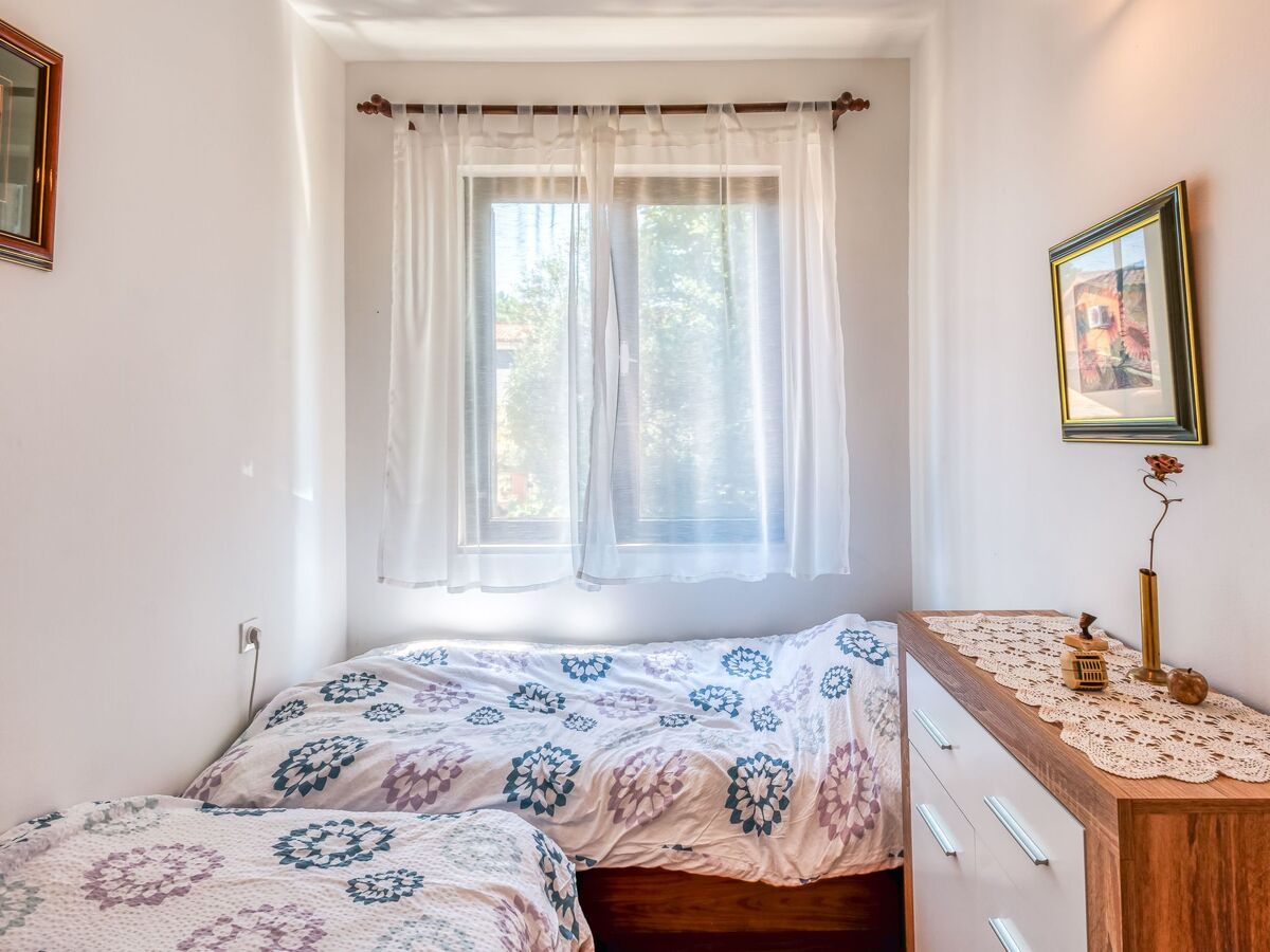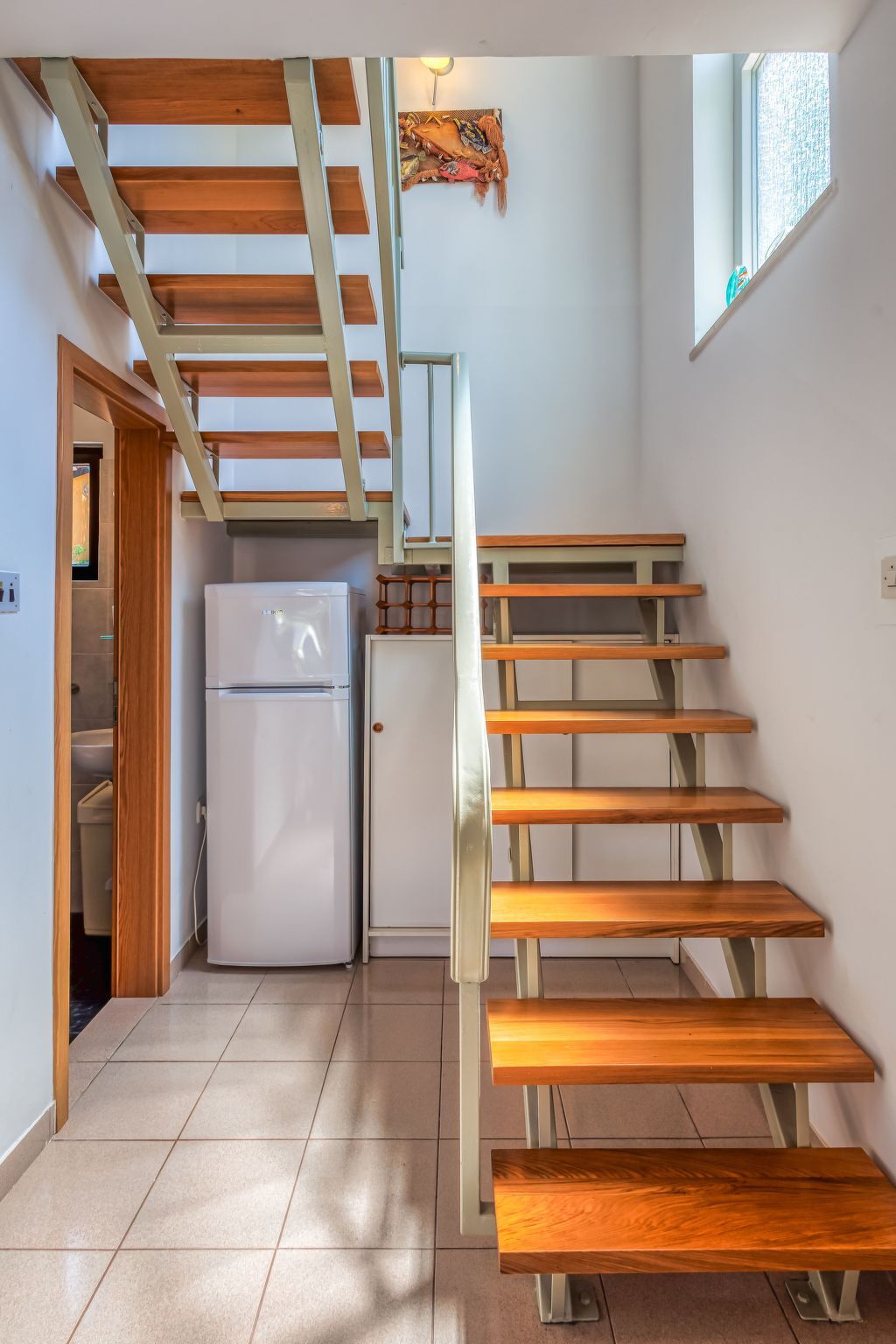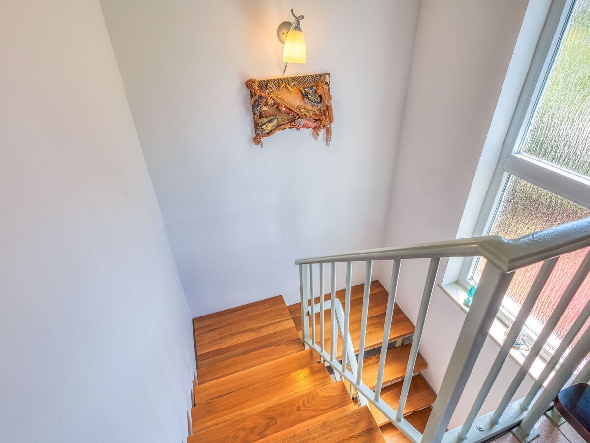 The two bedrooms on the upper floor provide a double bed 160cm wide and two single beds 90cm wide.