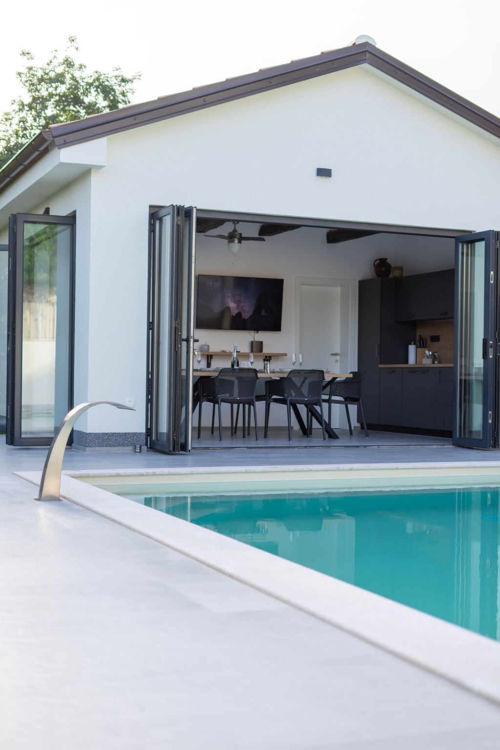 Dive into the heated swimming pool with salt water for a refreshing swim, unwind on the sun terrace with loungers for six, or rinse off under the outdoor solar shower.