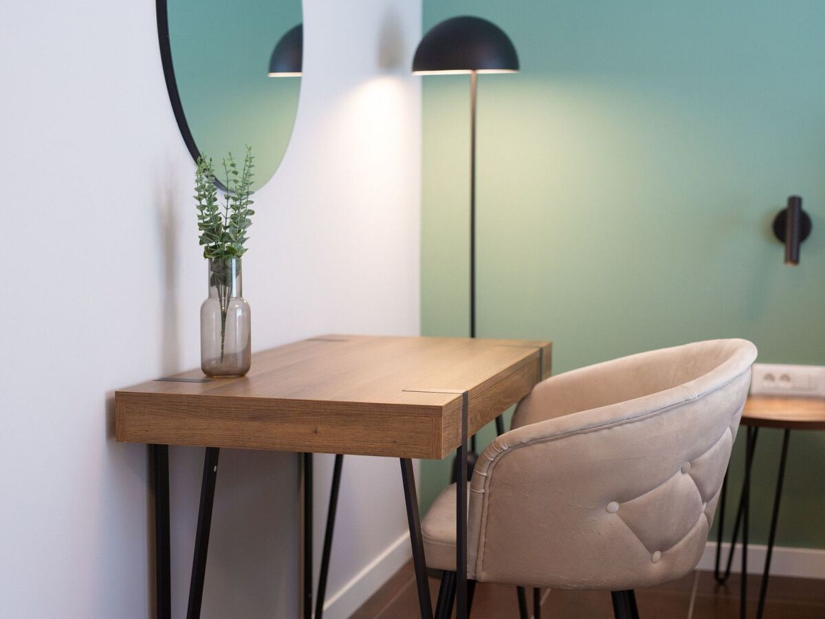 fully equipped kitchen, tastefully decorated living room, and dining room are located on the mezzanine floor of the villa.