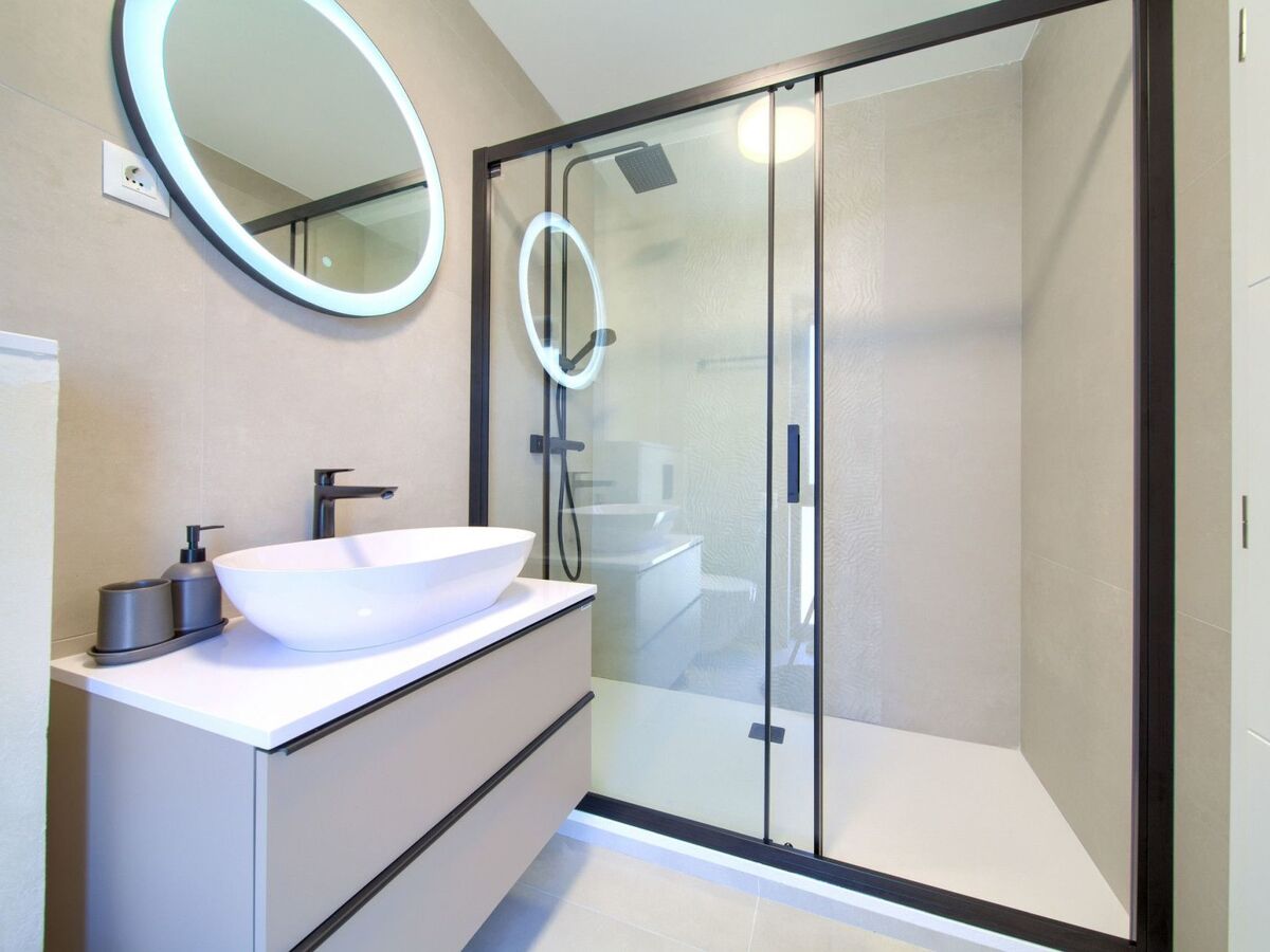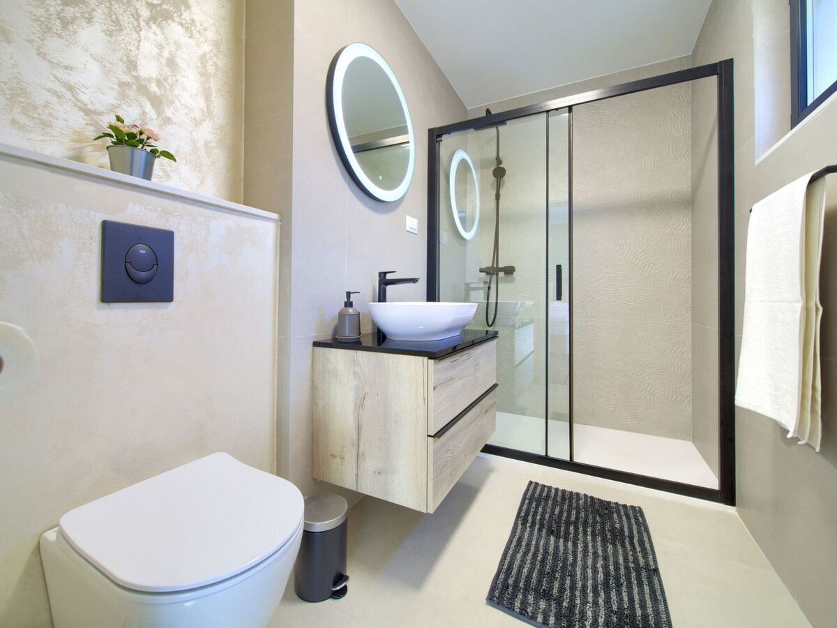 The living room offers a large corner sofa and a smart TV with a Netflix option.The staircase leads to the first floor where there are 2 bedrooms with an en-suite bathroom and TV in each room.