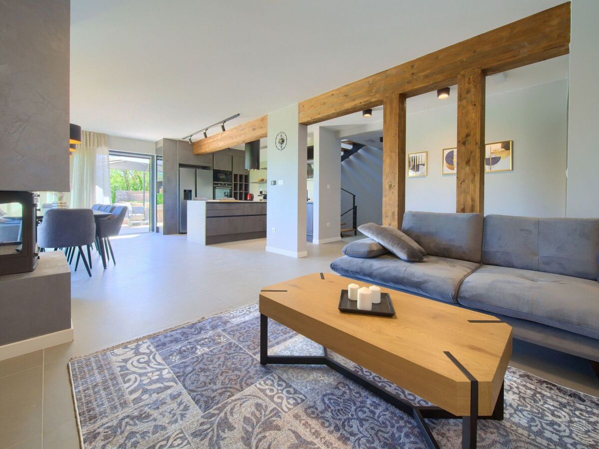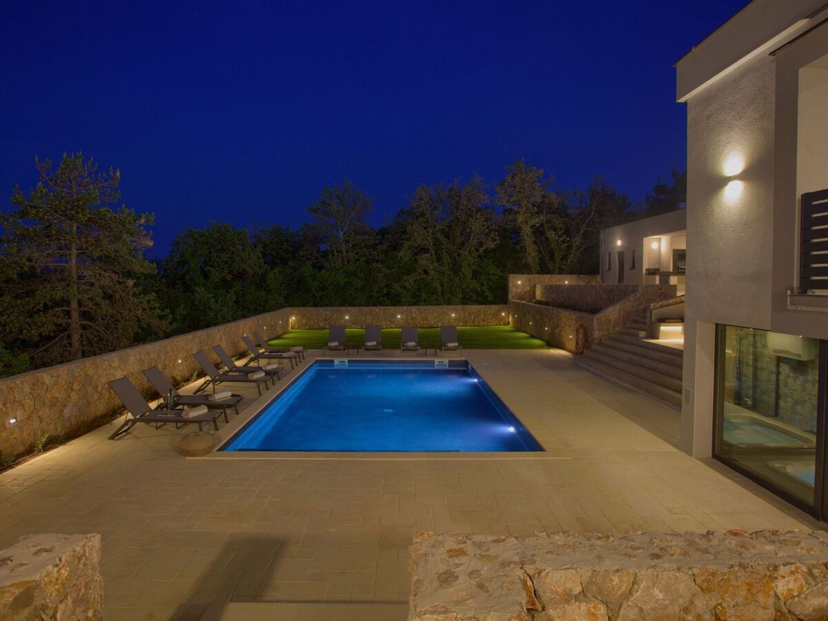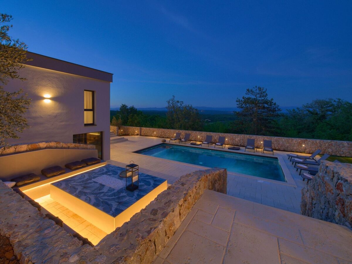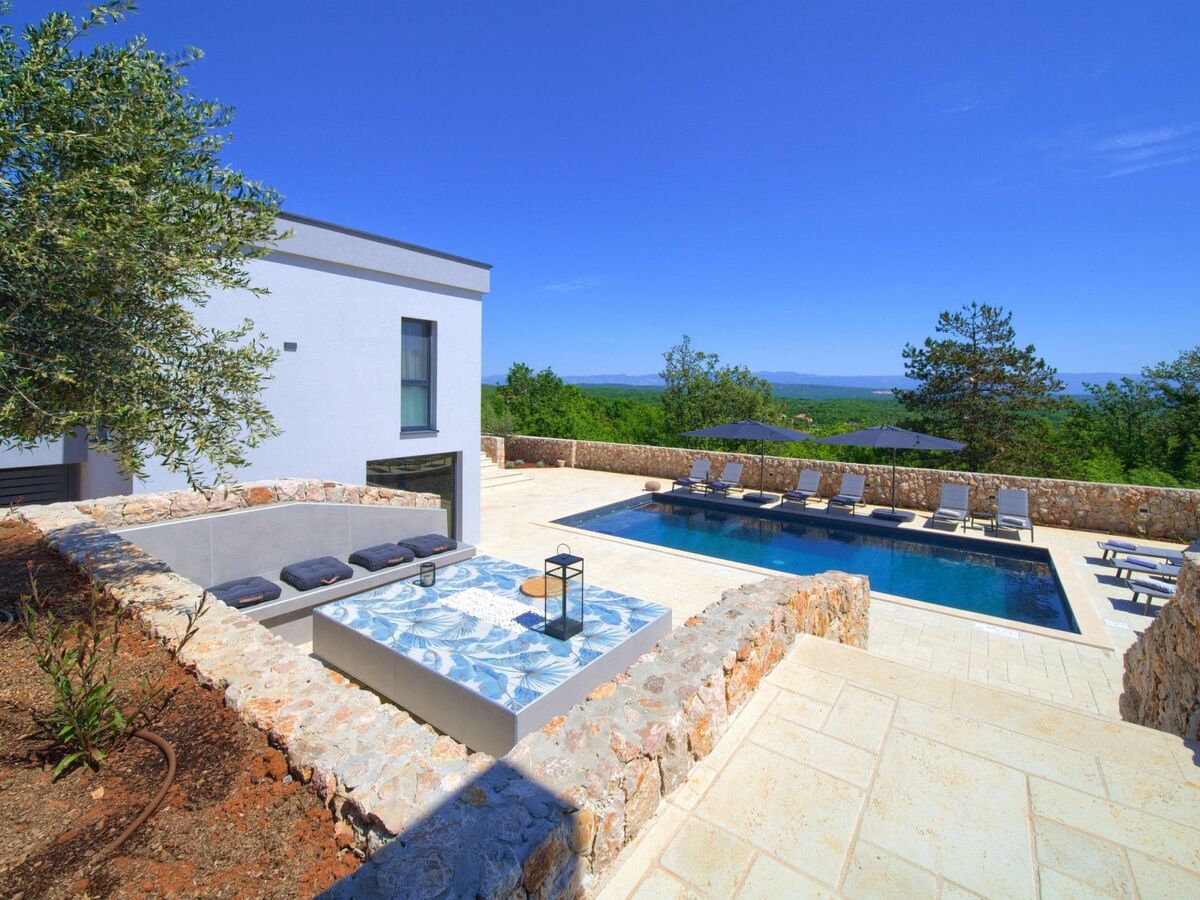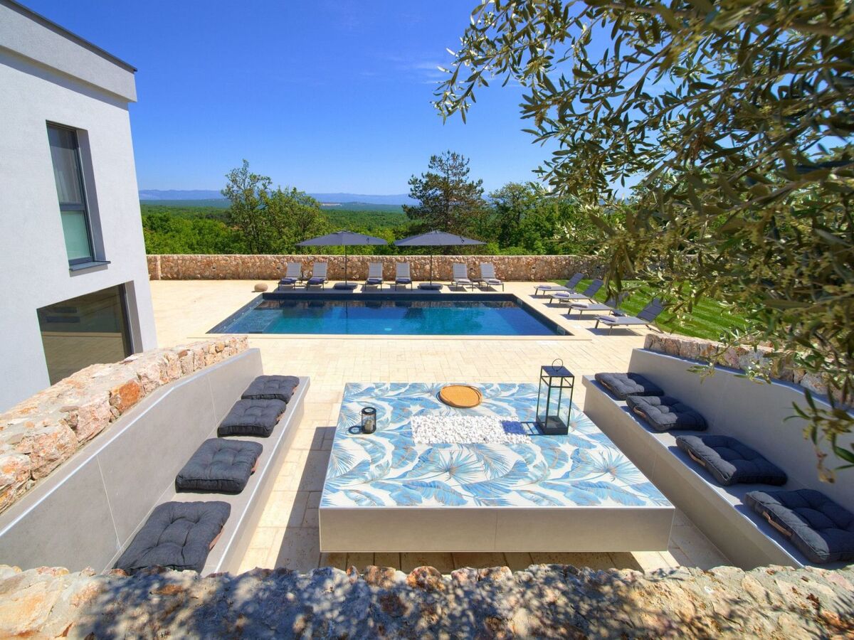 The outdoor terrace is dominated by a spacious 50 m² swimming pool and a lounge area with comfortable cushions suitable for enjoying both during the day and in the evening.