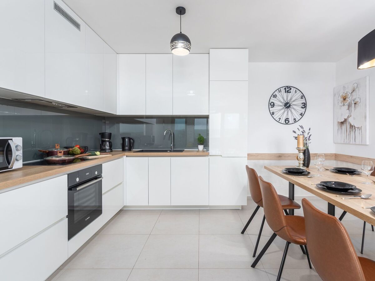 The living area is complemented by a highly equipped kitchen, complete with an induction hob, coffee machine, dishwasher, electric kettle, and mini-oven, making meal preparation a breeze.