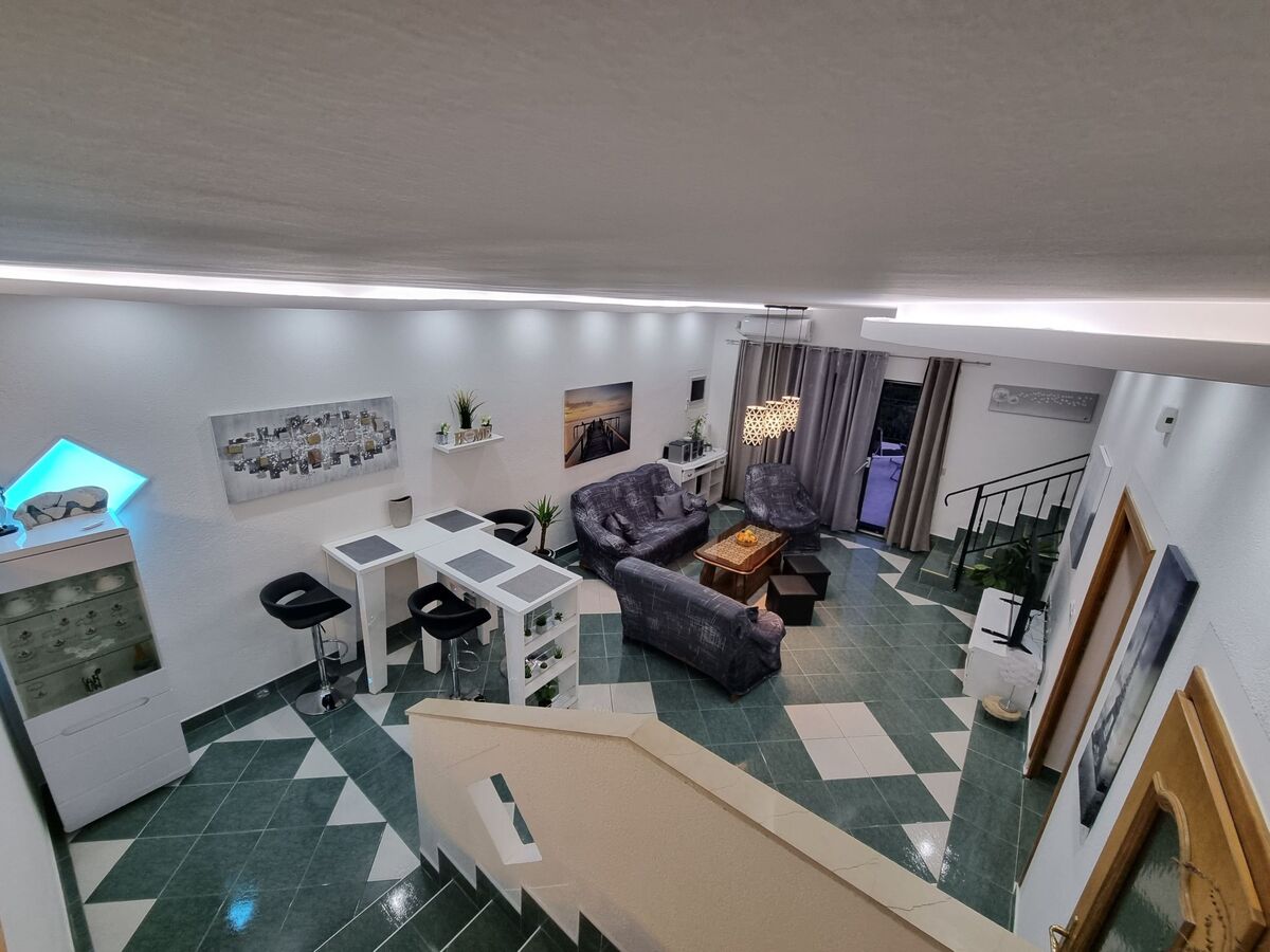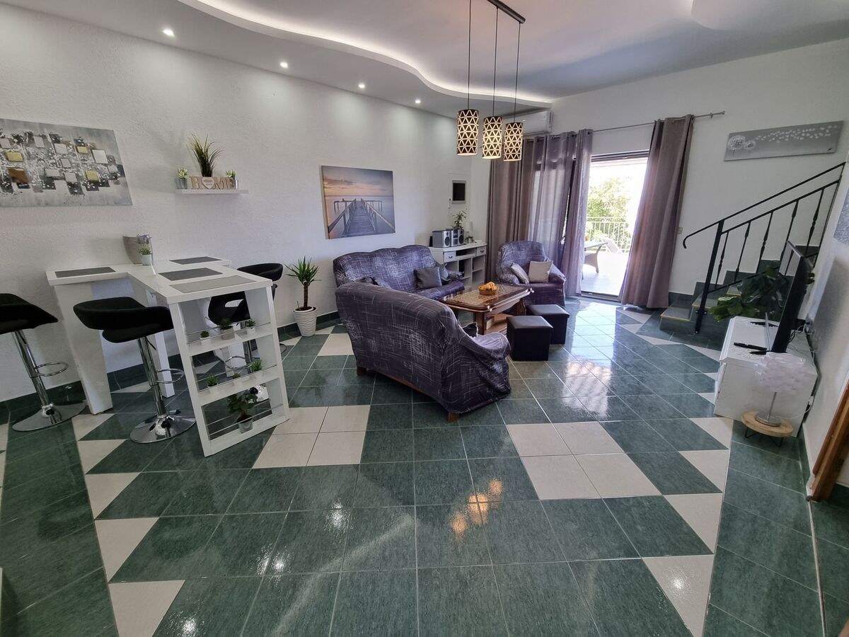 The ground floor welcomes guests with a fully equipped kitchen and dining area that merges into a cozy living room, complete with air conditioning and a terrace that offers stunning sea views, complemented by a convenient toilet.