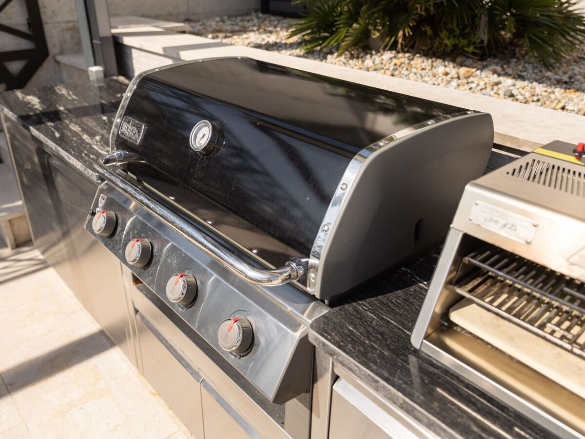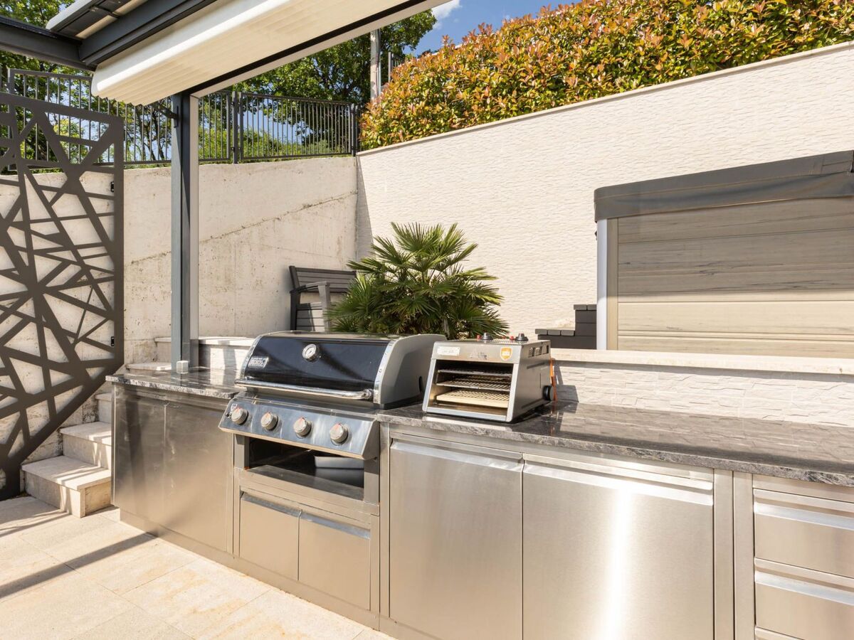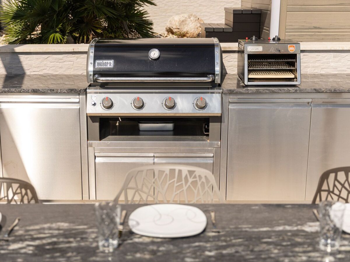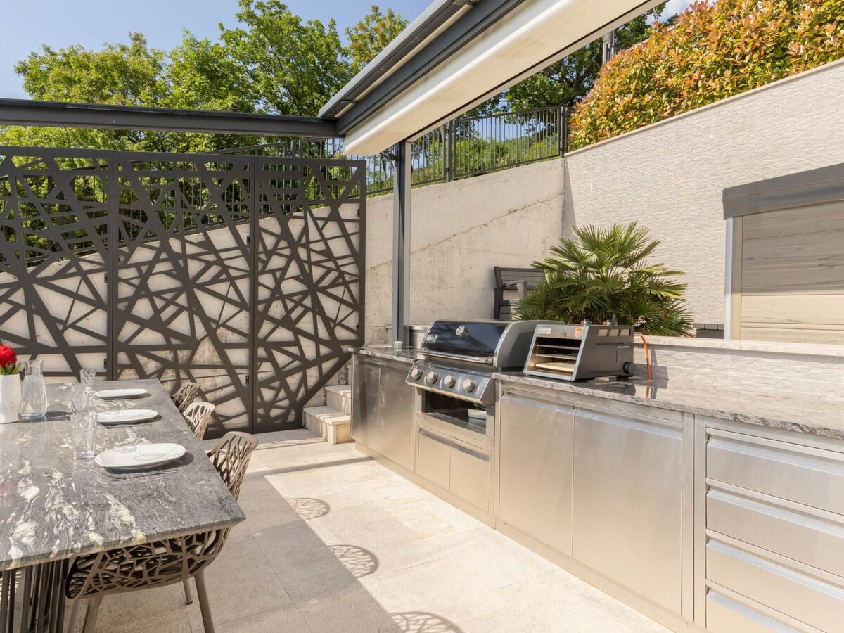 Huge dining table and outdoor kitchen with gas barbecue on the extra-large sun terrace.