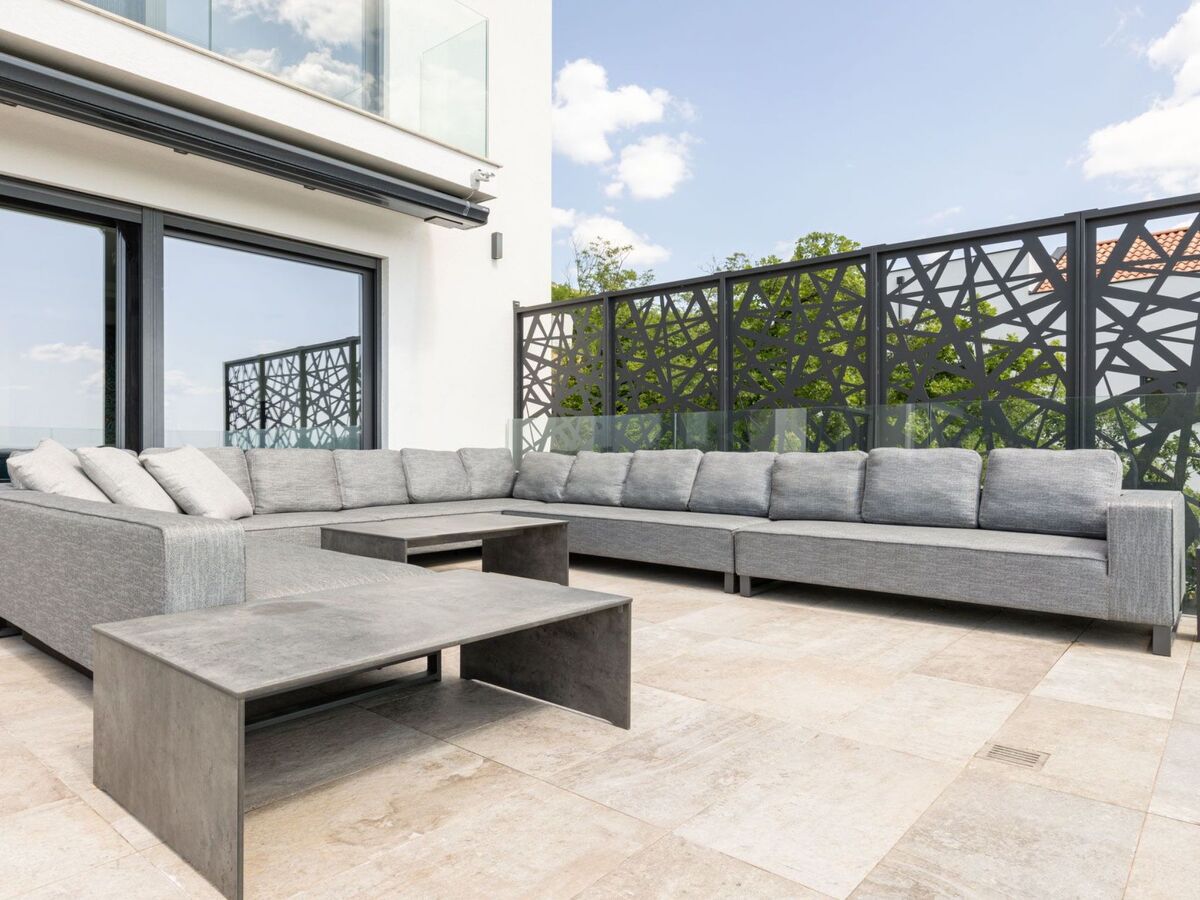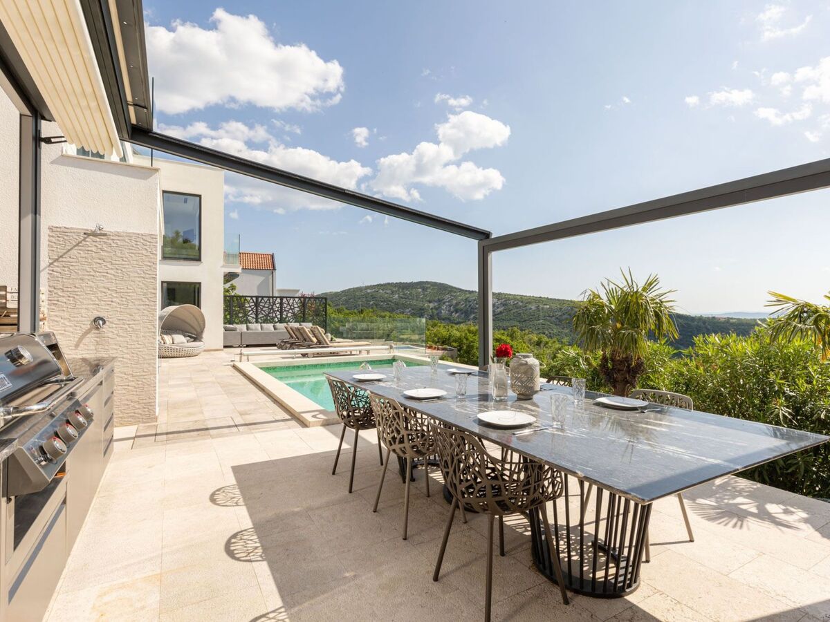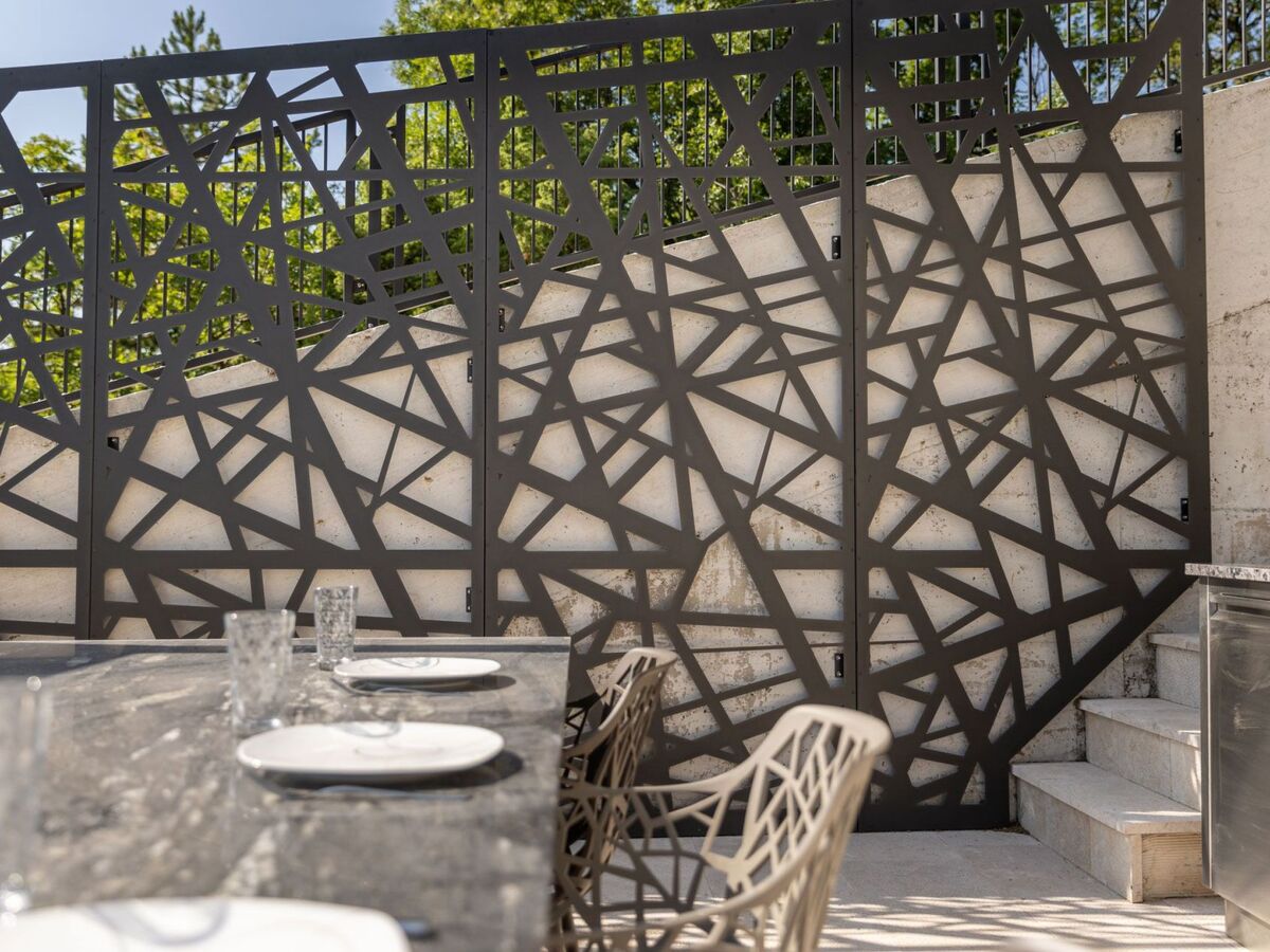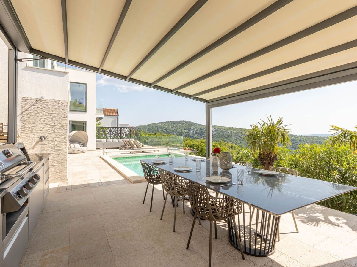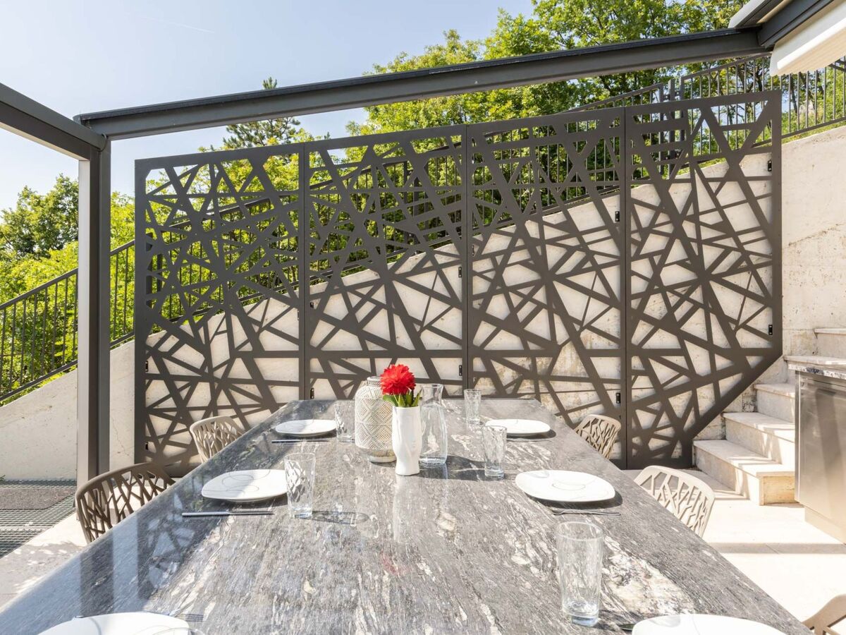Huge dining table and outdoor kitchen with gas barbecue on the extra-large sun terrace.