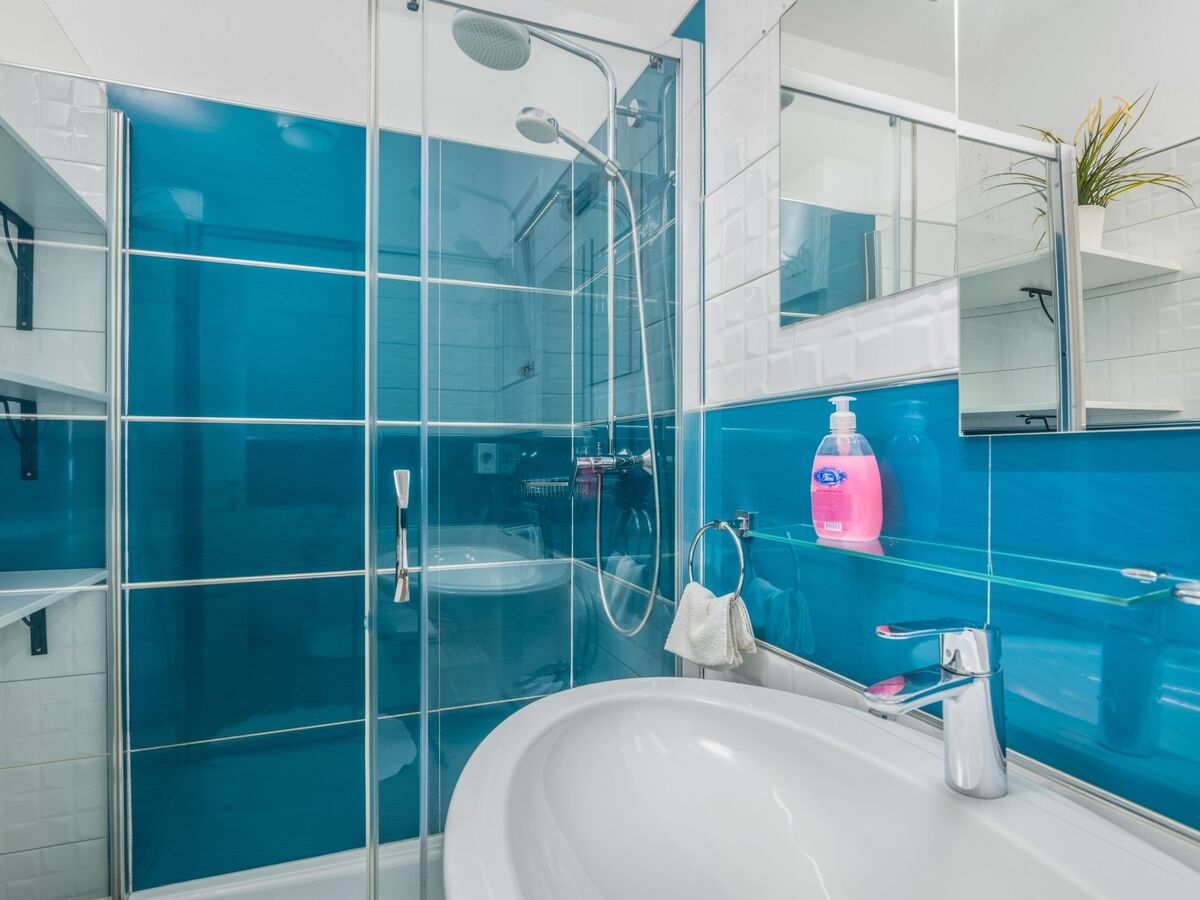 The two modern bathrooms each have a shower, wash basin and toilet.
