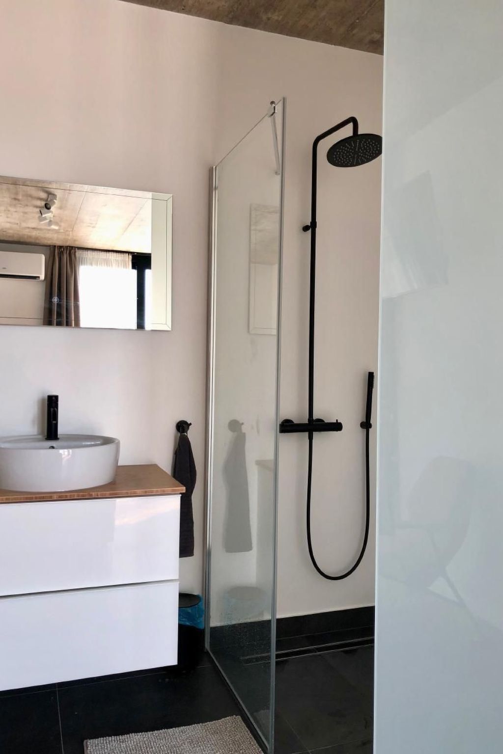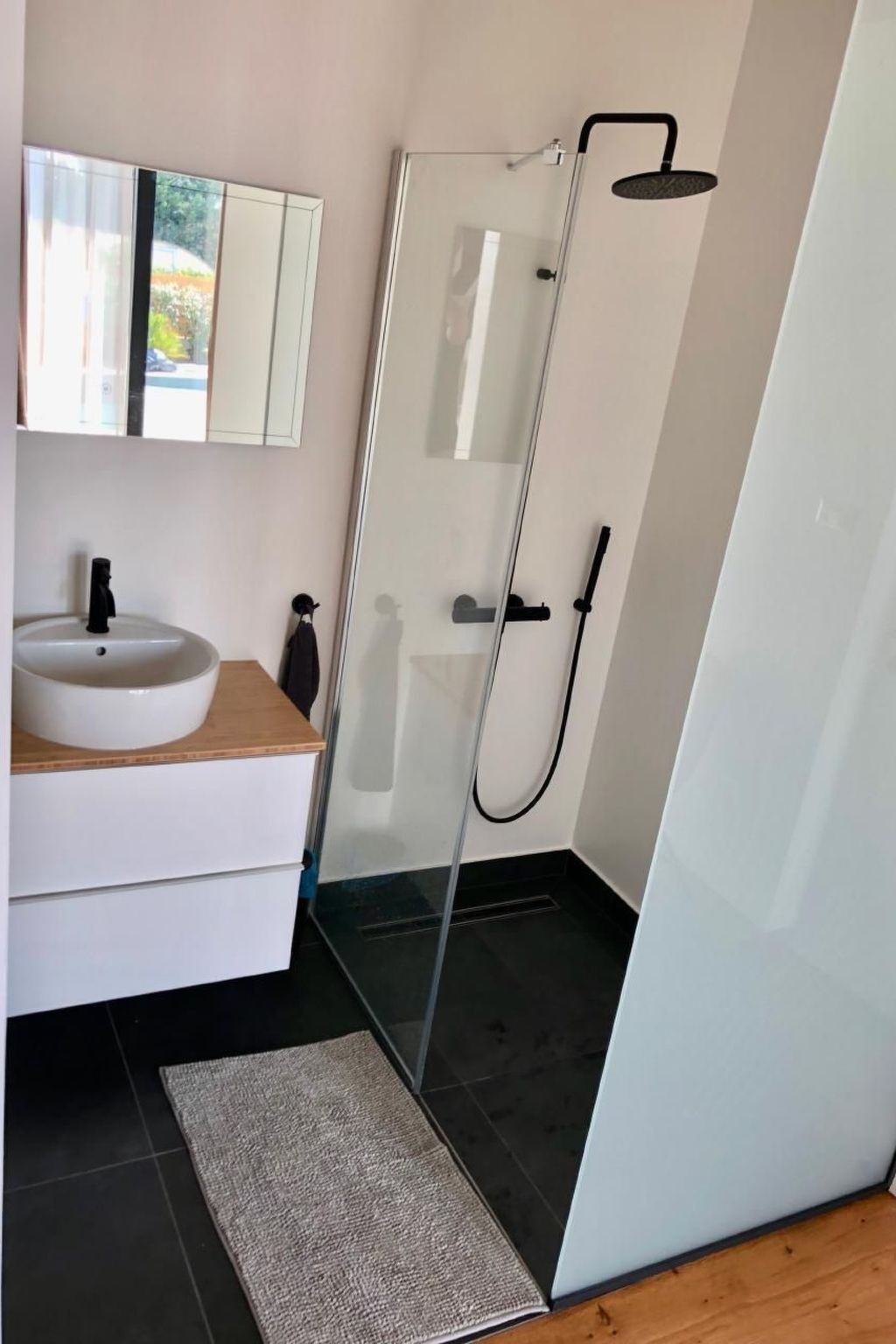 Salle de bain 2 tailles 4 m2 avec douche à l'italienne, rétroéclairage à led, toilettes et éclairage d'ambiance Devant la maison, terrasse couverte de 16 m2 avec des chaises et une table conçues.