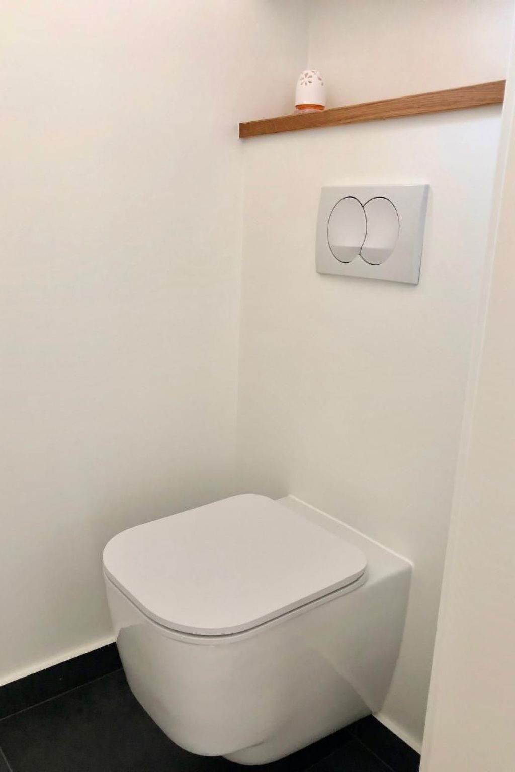 Salle de bain 1 taille 6 m2 avec toilette, machine à laver, baignoire et lampes ambiantes.