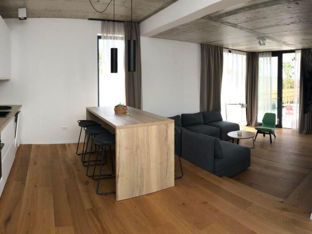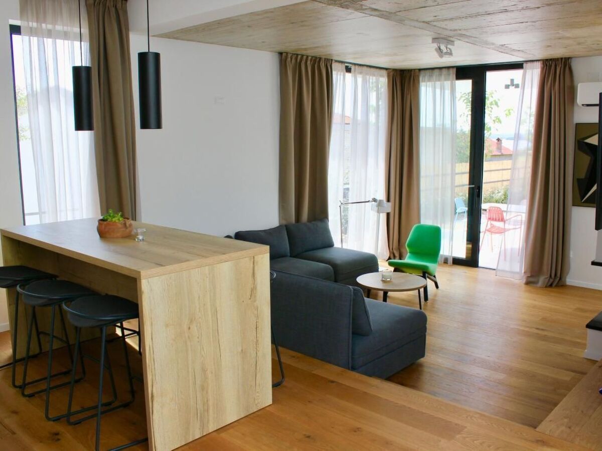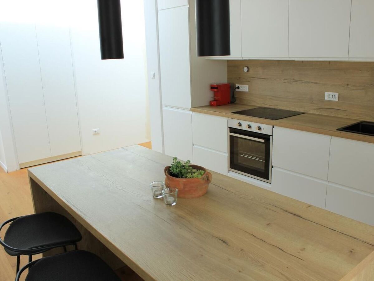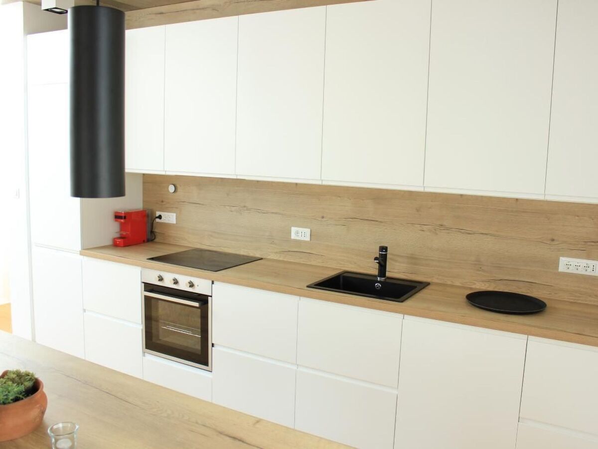 Cuisine entièrement équipée avec four, réfrigérateur avec congélateur, lave-vaisselle, cuisinière électrique (à induction), cafetière, bouilloire, grille-pain, table haute, 6 chaises conçues par Prostoria, éclairage ambiant.